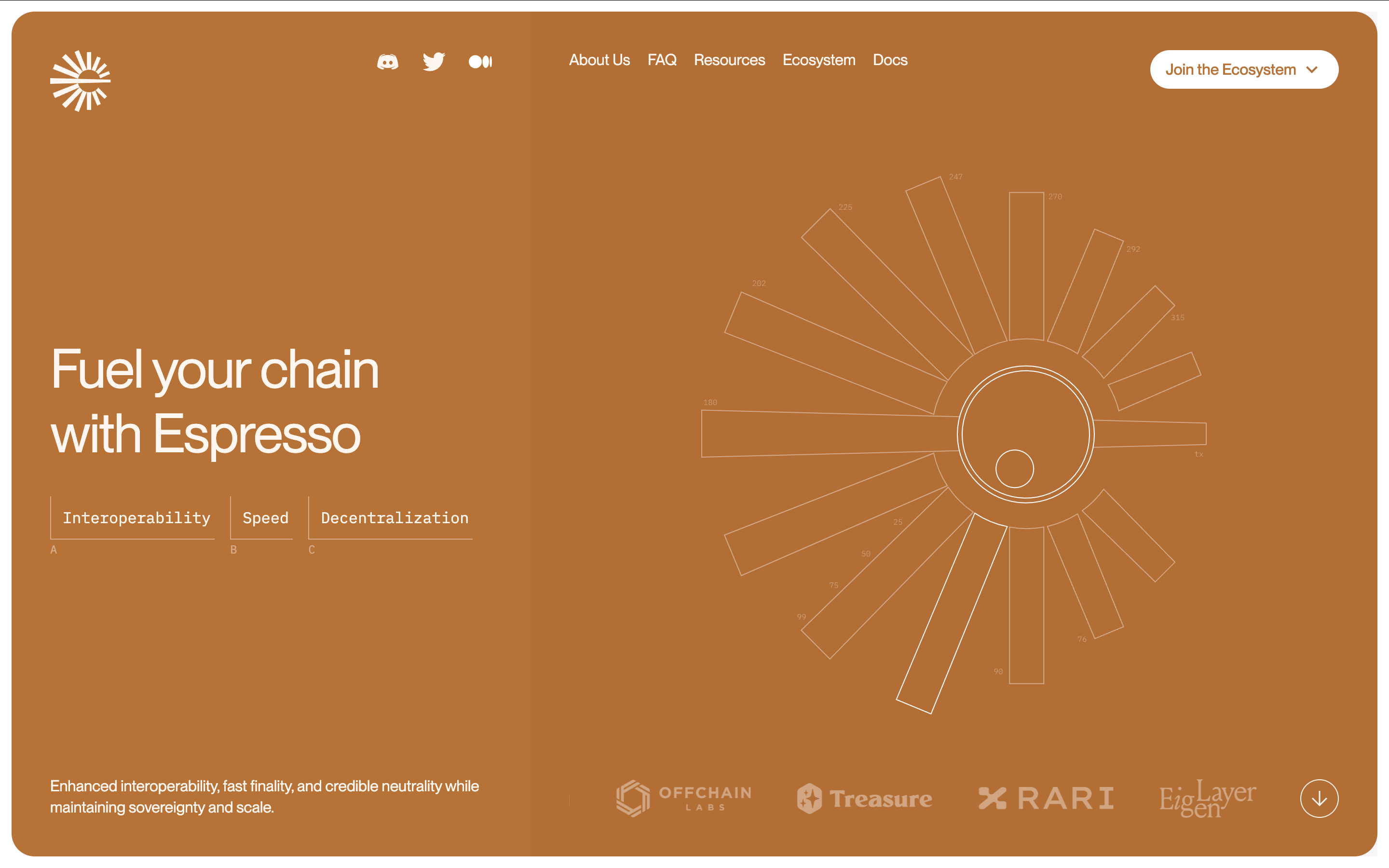 Espresso network providing rapid finalization of transaction order and data across chains and chains can sell transaction sequencing rights to block builders to maximize chain revenue and minimize friction in interoperating with other chainsOperates the Espresso marketplace.