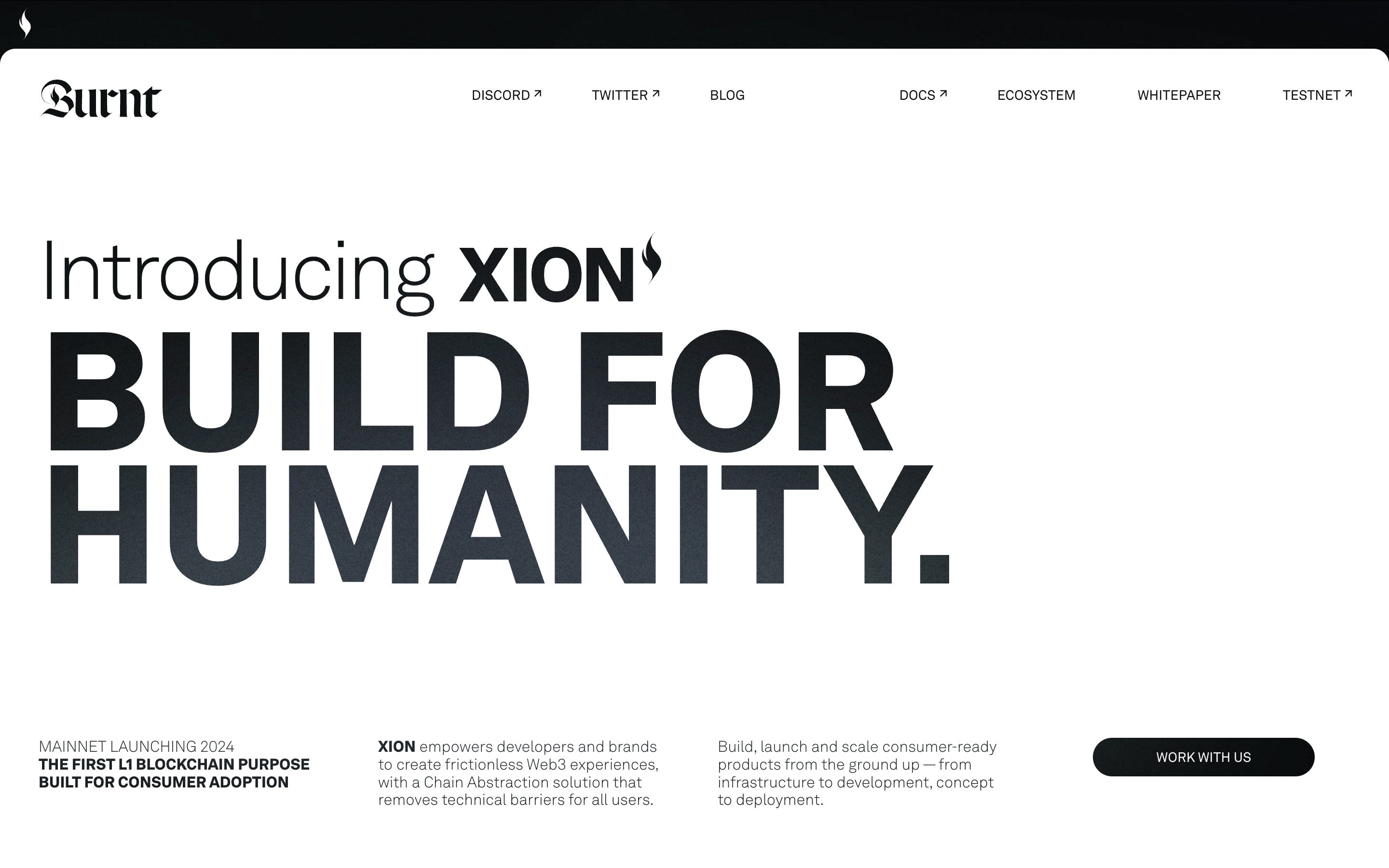 XION is a modular abstraction layer developed by Burnt specifically for use by the general public. xion provides seamless legal tender on/off ramps, direct credit card purchases, familiar web2 login, secure account abstraction for mobile support, gastoolkit, including zero fees, to remove technical barriers to cryptocurrency for the average user.