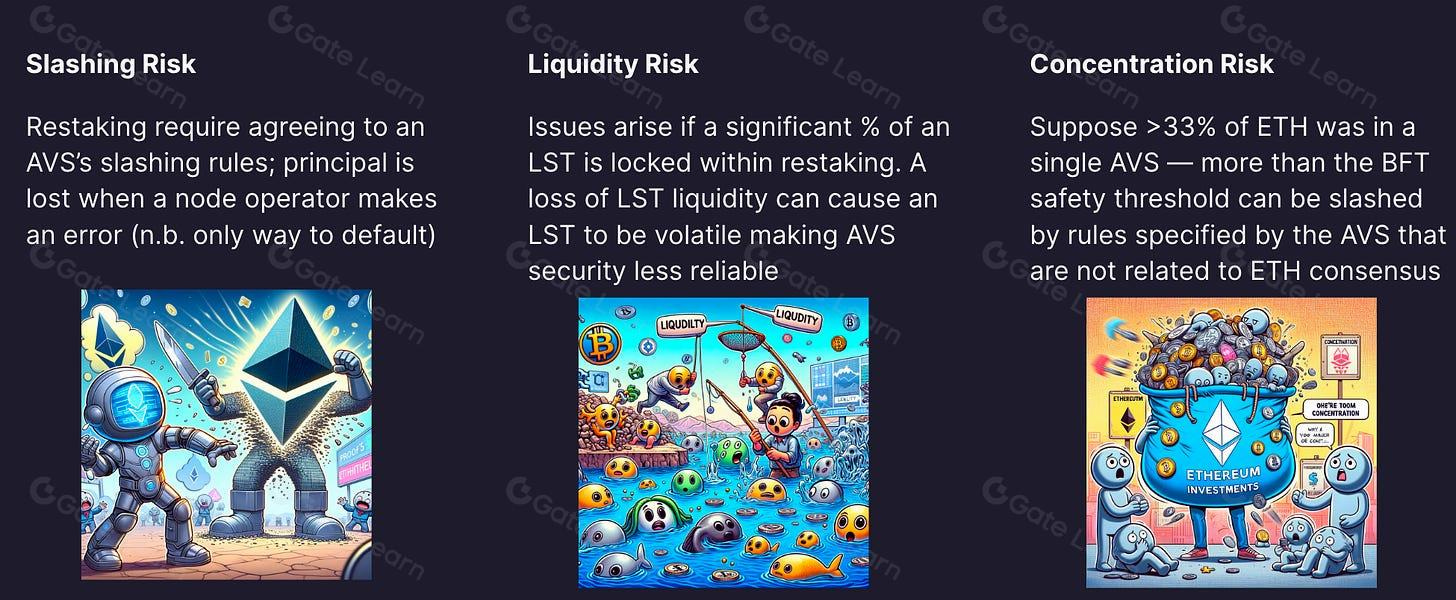 Protocol-specific slashing conditions, risks of EigenLayer smart contracts, challenges of centralization, lack of liquidity, etc.