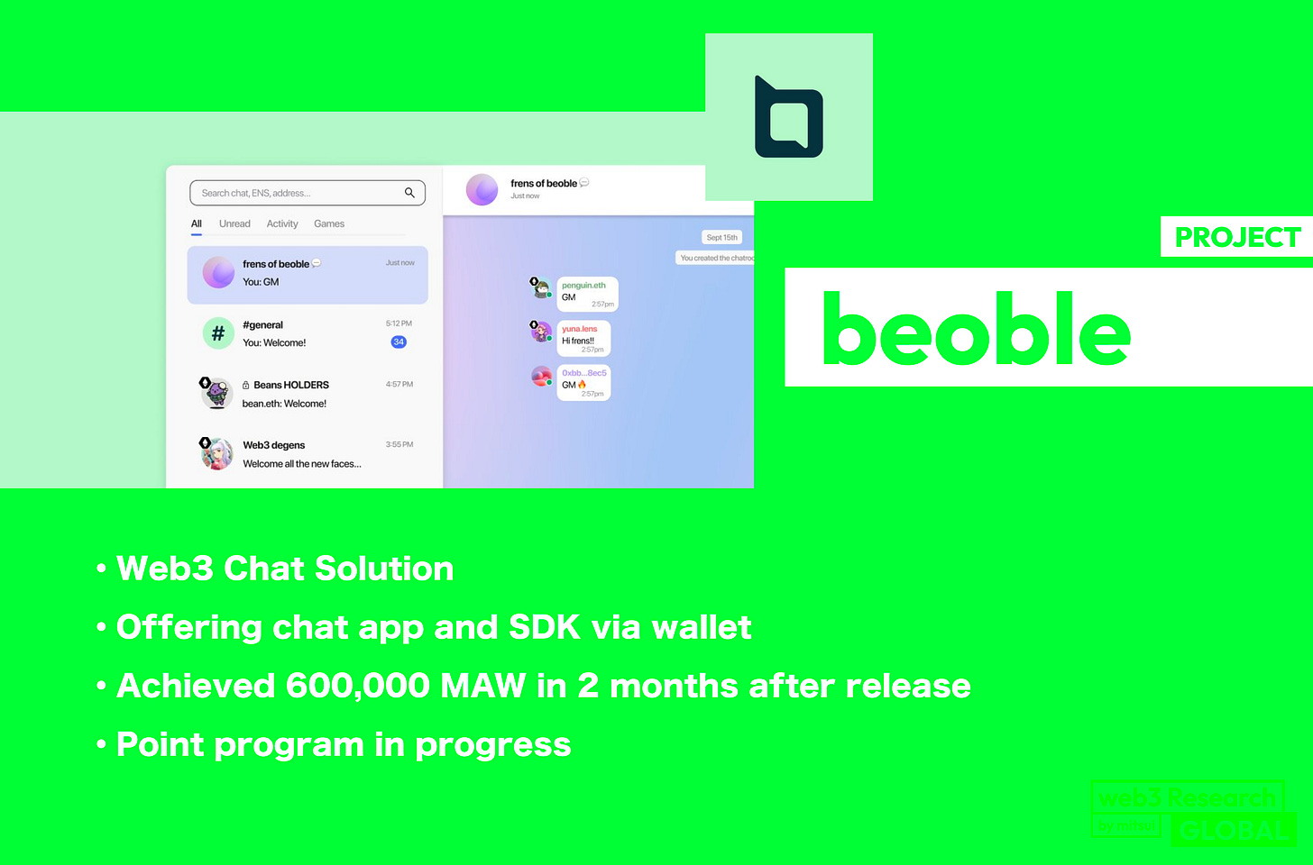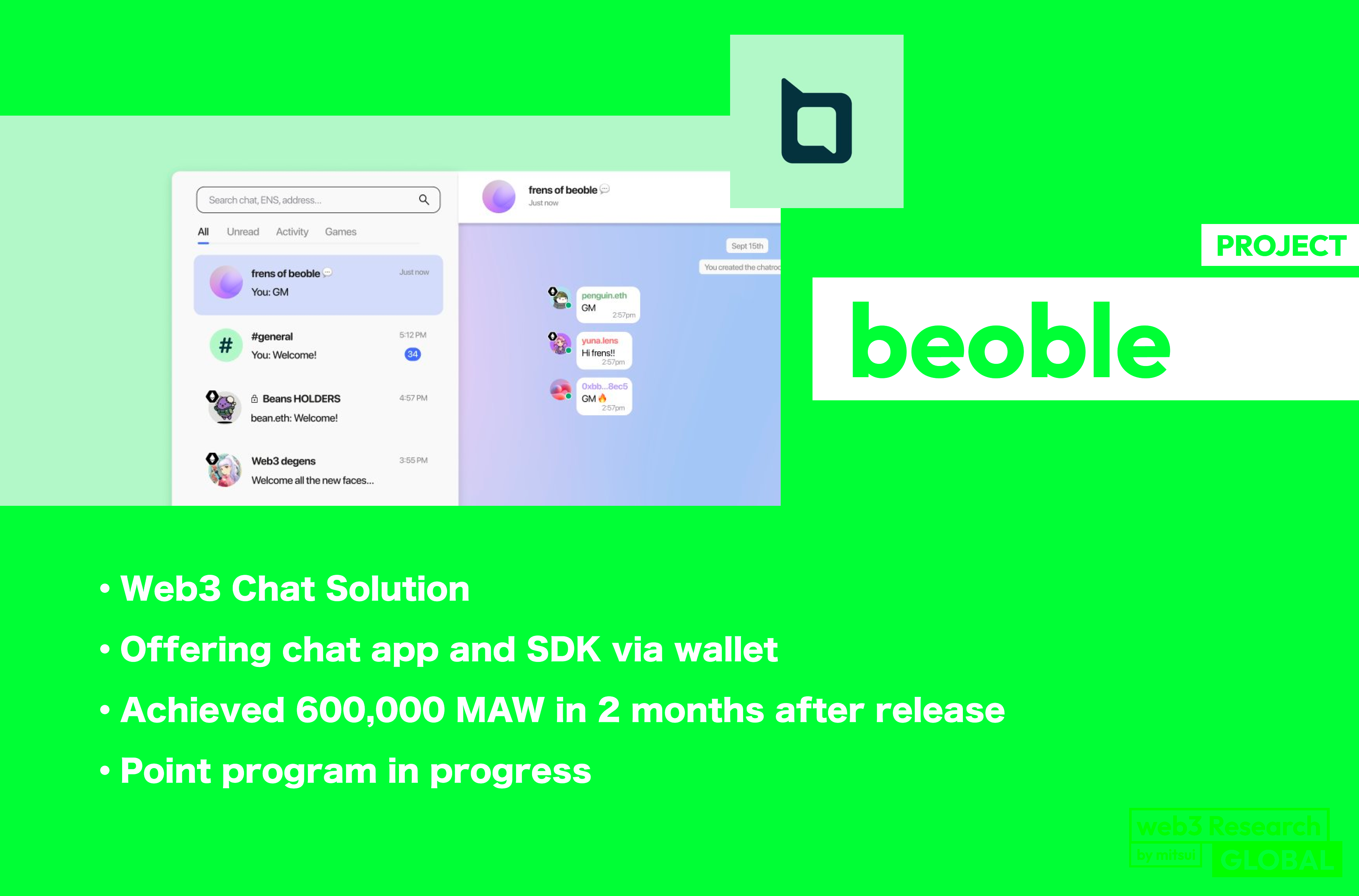 【Beoble】Web3 Chat Solution / Offering chat app and SDK via wallet / Achieved 600,000 MAW in 2 months after release / Point program in progress / @beoble_official