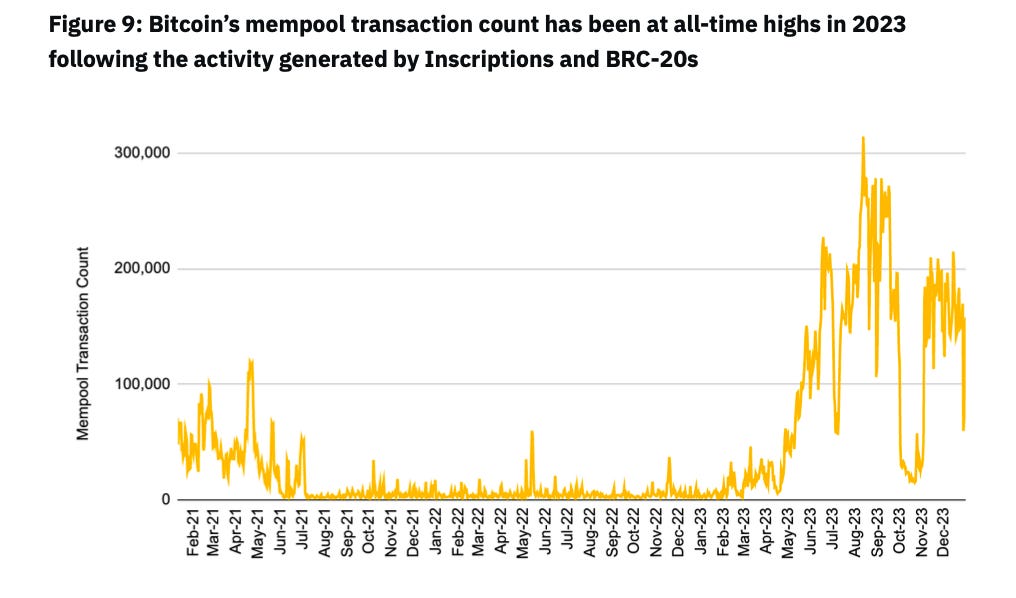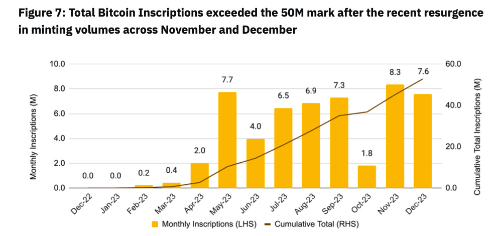 Daily transactions have steadily increased throughout the year, reaching a peak of 5.3 million transactions mainly driven by activity based on Inscription on December 16, 2023.