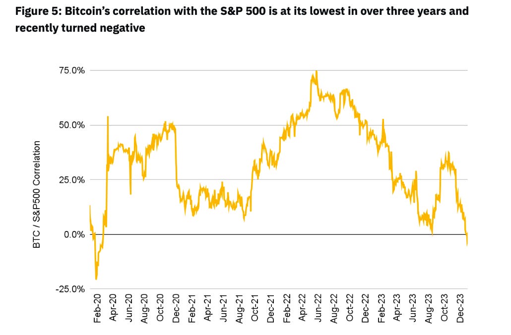 In the past, the correlation between Bitcoin and the S&P500 has fluctuated between -20% and 20%, but since mid-2020, there has been a significant correlation of around 50%.