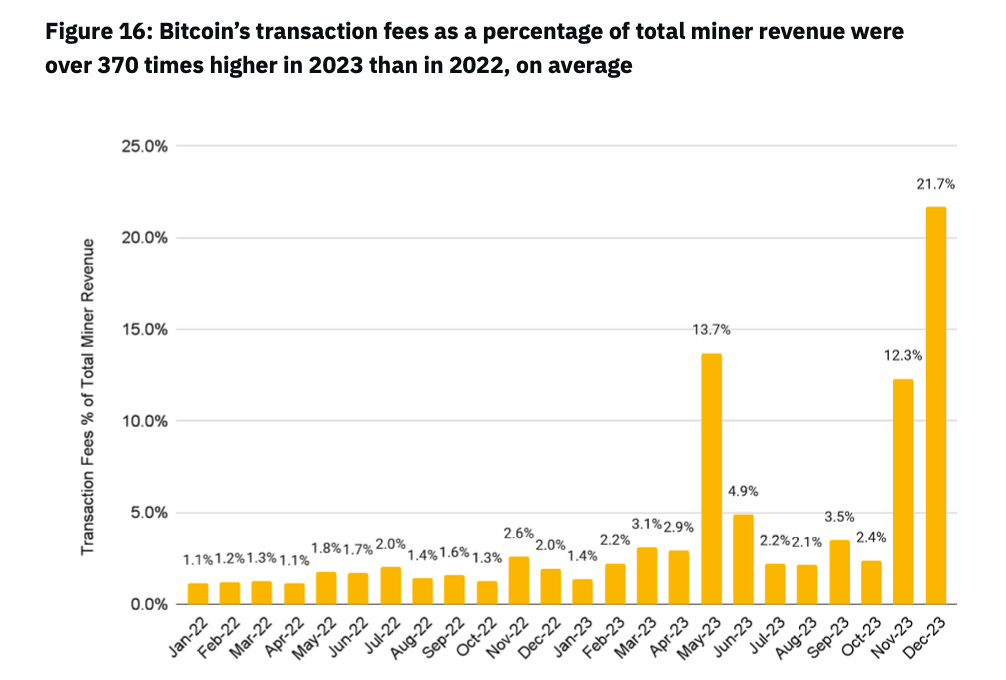 It is evident that transaction fees have increased from an average of 1.6% of total miner rewards in 2022 to over 5.5% in 2023.