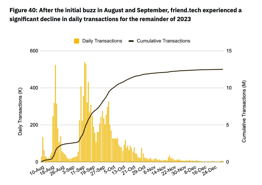 After the initial excitement in August and September, friend.tech experienced a significant decrease in daily transaction volume for the remainder of 2023.