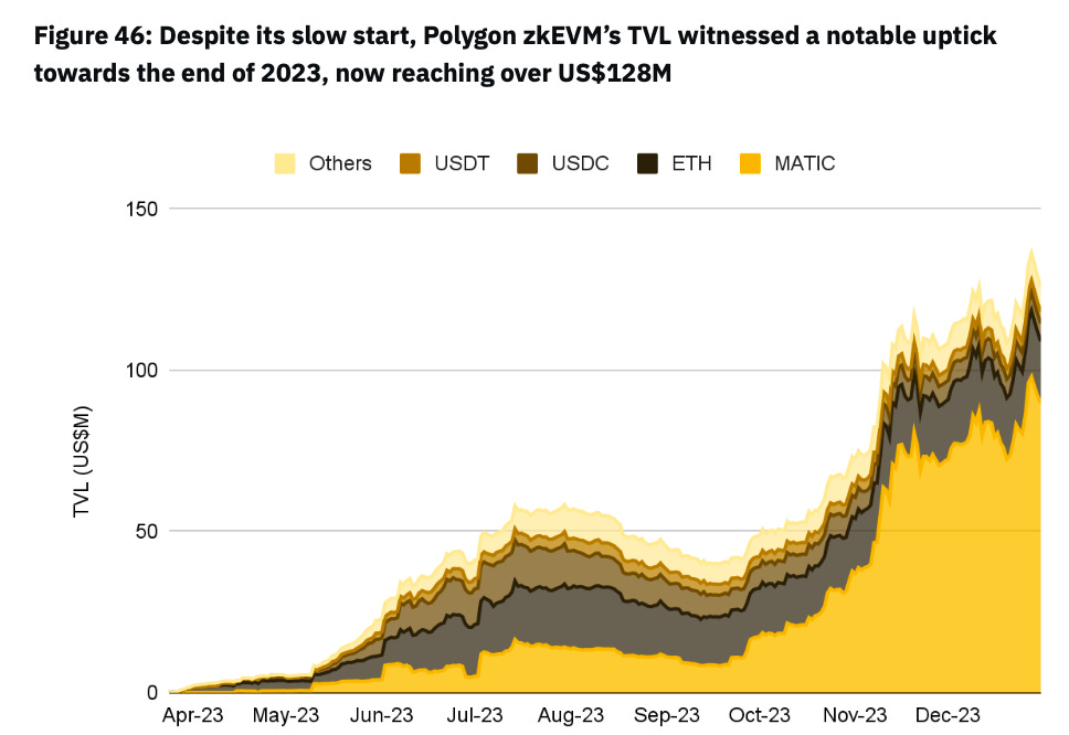 The initial growth of Polygon zkEVM was relatively slow compared to its competitors in the zkEVM space, but it picked up momentum in the second half of 2023, surpassing $128 million in L2 TVL and attracting over 100,000 depositors.