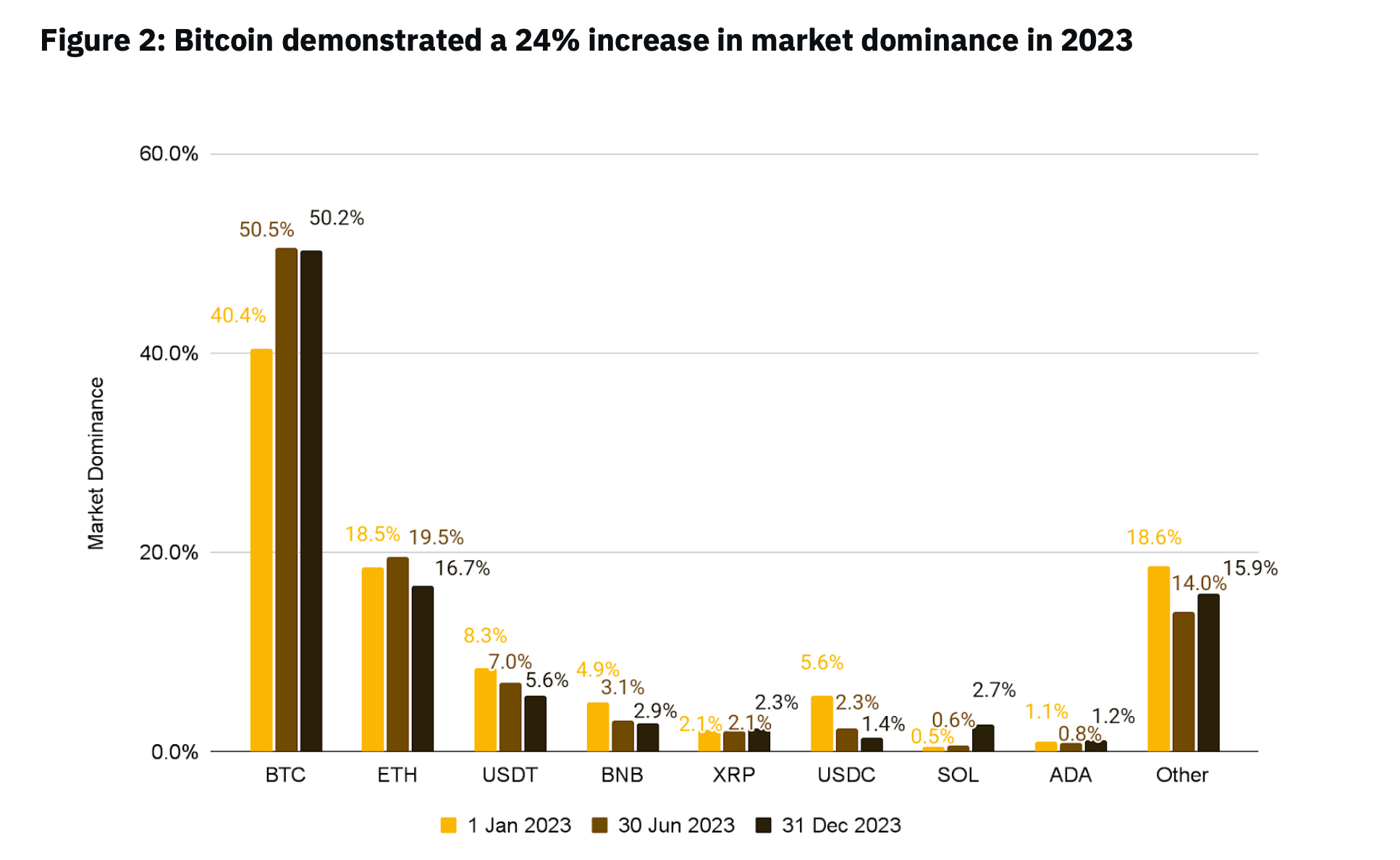 As a result, Bitcoin's market dominance increased from 40.4% to 50.2%, now accounting for more than half of the total market capitalization of the cryptocurrency market.