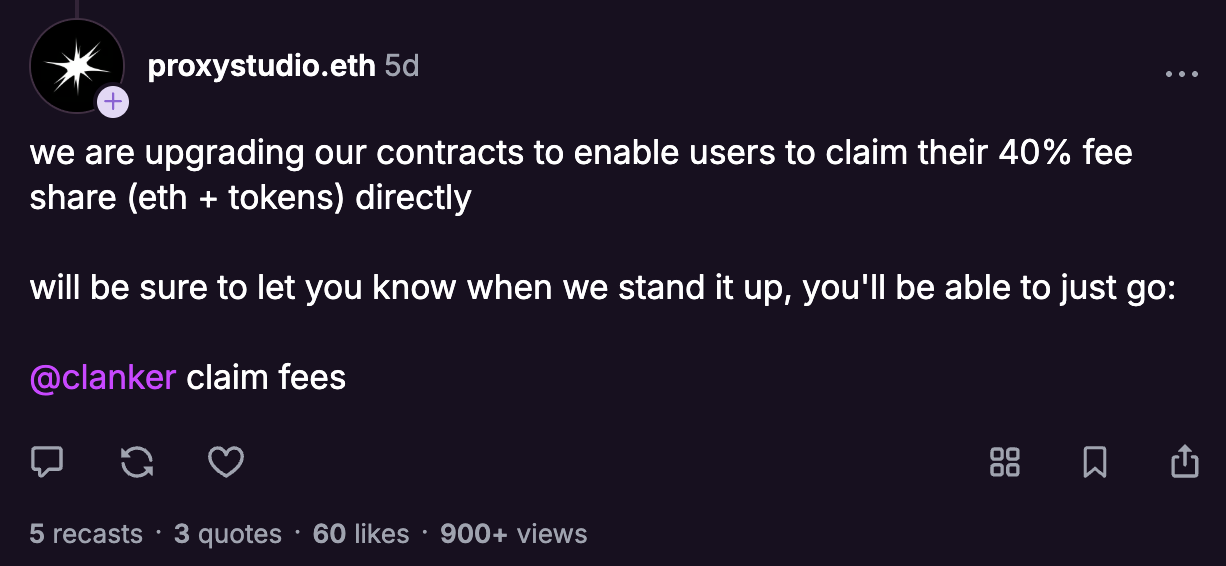 After all of this excitement, clanker implemented the ability to return 40% of transaction fees to the token issuer.
