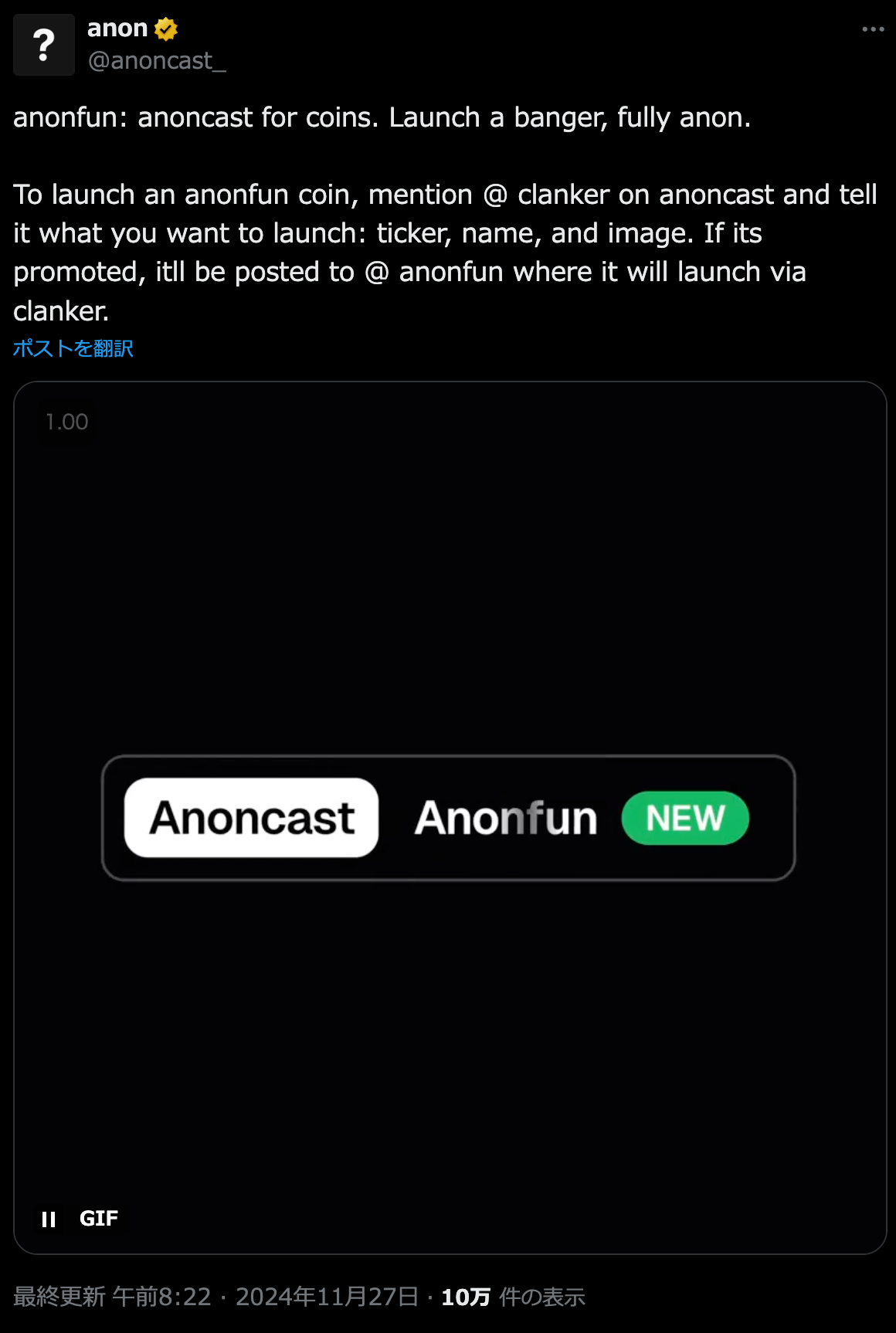 The community continues to thrive, and on November 27, anoncast released anonfun, which allows users to issue tokens anonymously.Information posted here will reach the clanker via anocast and be issued.