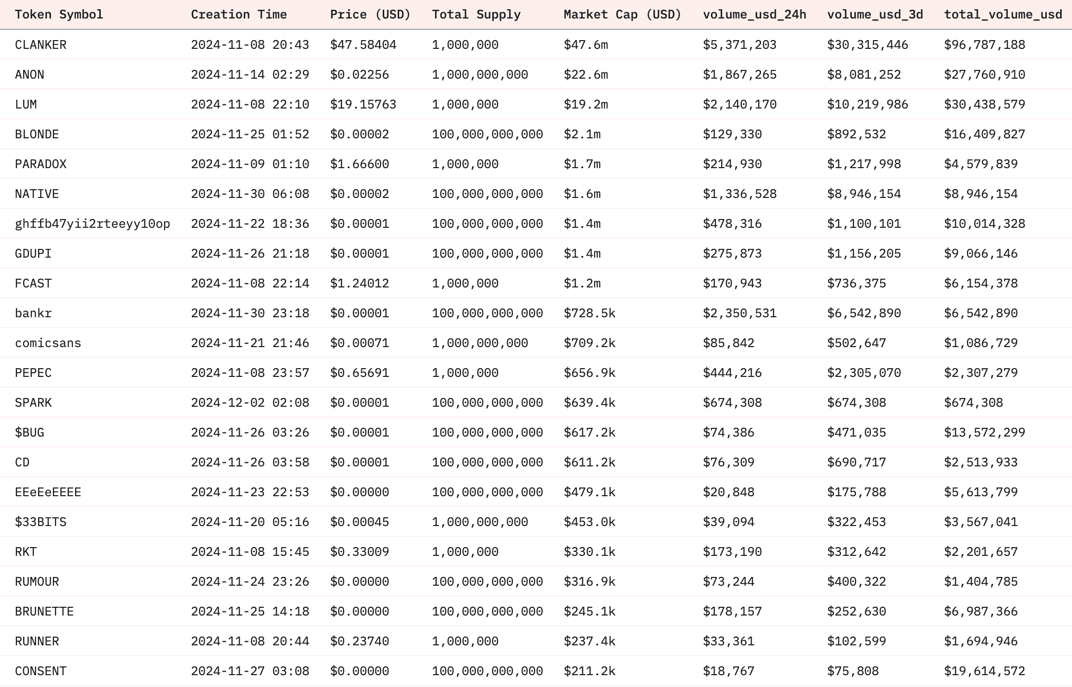 Let me explain the background behind the popularity of this product.Three main tokens have driven this popularity.The top three market caps are CLANKER, ANON, and LUM.