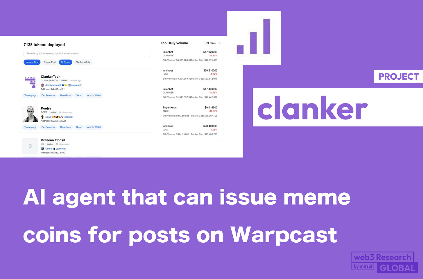 【clanker】AI agent that can issue meme coins for posts on Warpcast / Over 7,000 tokens issued in 3 weeks of release, market cap over $100M / Vitalik also purchased / @_proxystudio