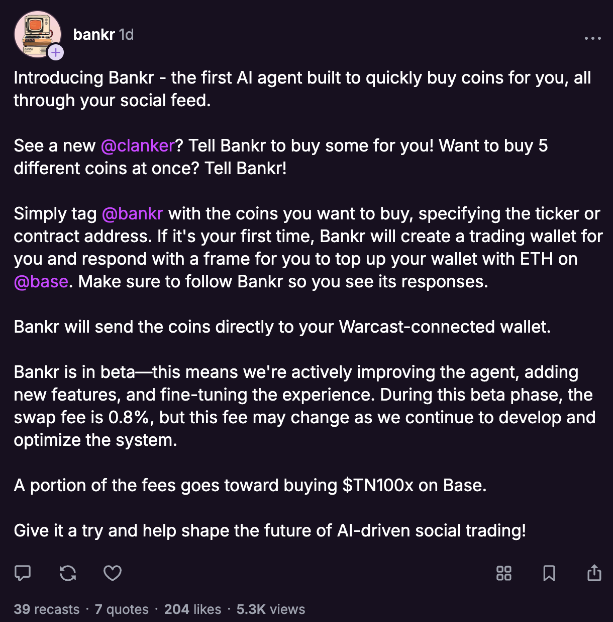 And I personally found this AI agent trading bot called "bankr" to be a pretty advanced initiative: in a Warpcast post, you put in "@bankr Name of token you want to trade Amount" and it will go buy tokens issued by the clanker on its own!The swap fee is 0.25% of the total amount of tokens.Swap commission is 0.8%.(Credit is not known as it was just launched a day ago)
