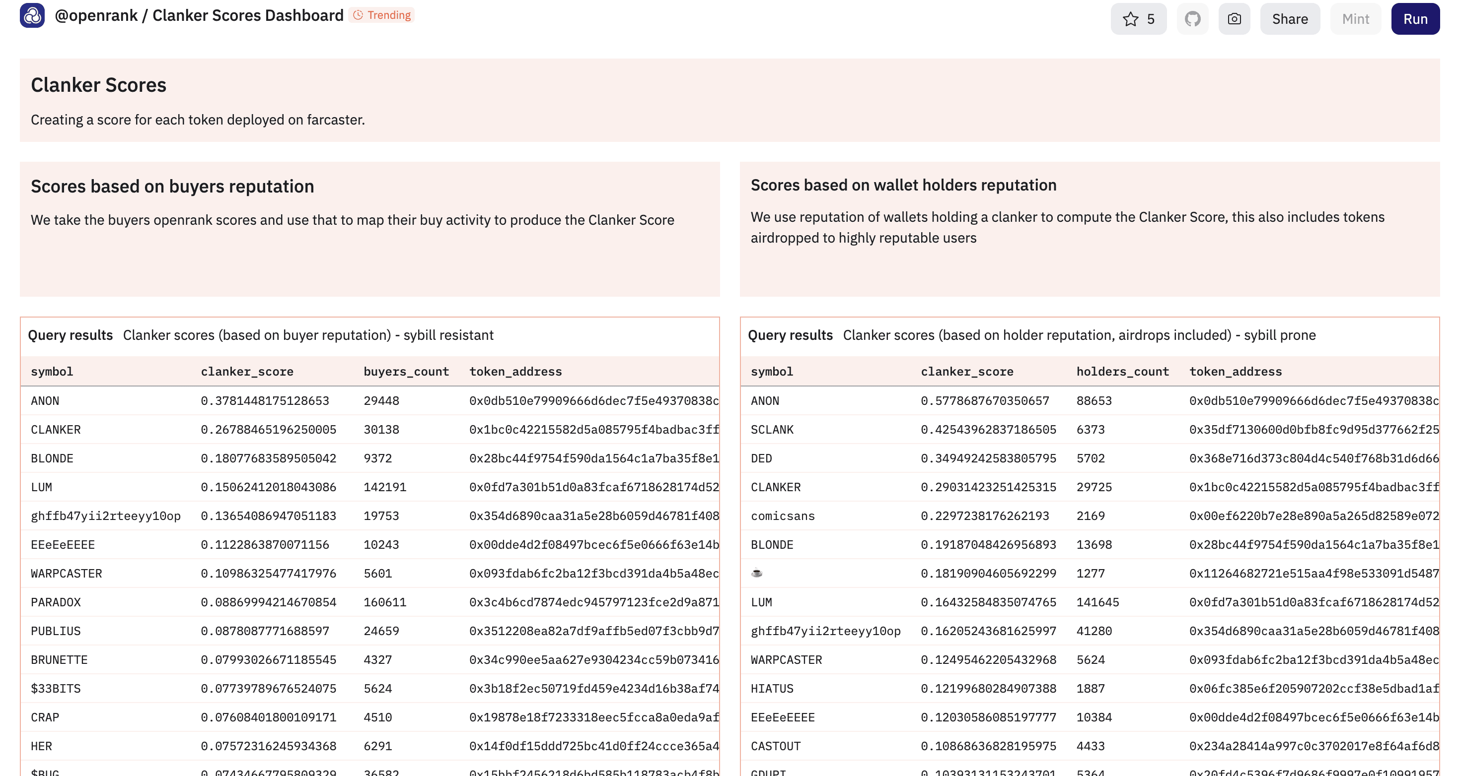 In addition, a protocol called OpenRank has created a score site to evaluate Clanker tokens, and the surrounding ecosystem is gaining momentum.