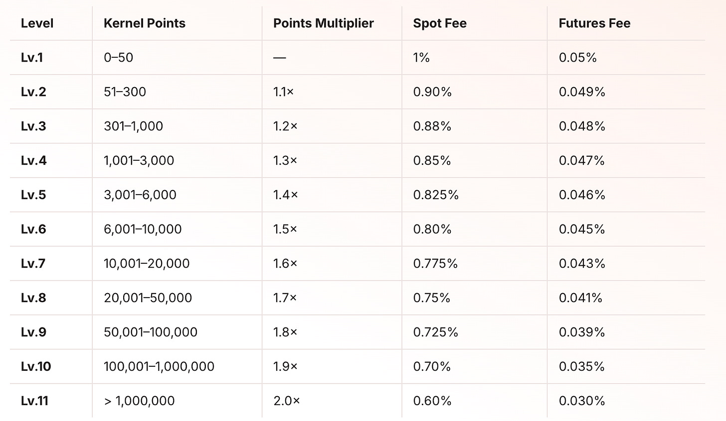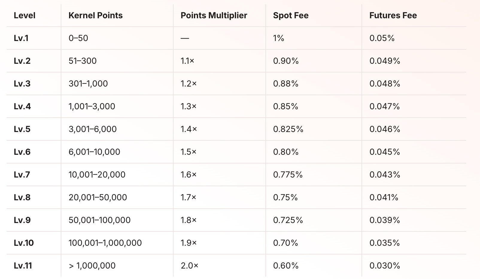 Please note that easy.fun’s transaction fees consist of a two-tier structure: the base fee from the Hyperliquid protocol plus easy.fun’s own markup. Users accumulate Kernel Points based on their activity, and their level (Lv.1 to Lv.11) increases according to the total points earned. The higher the level, the greater the discount applied to the easy.fun markup portion of the transaction fee.
