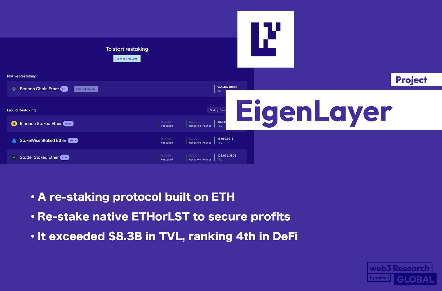 【EigenLayer】A re-staking protocol built on ETH / Re-stake native ETHorLST to secure profits / It exceeded $8.3B in TVL, ranking 4th in DeFi / @eigenlayer