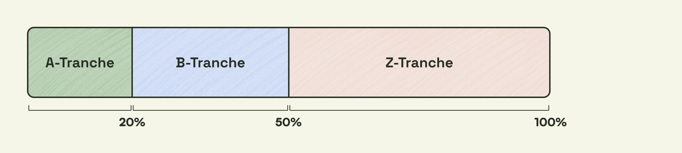 For example, the following is an example of an AMPL divided into tranches, with risk and maturity dates separated by A, B, and Z, respectively, receiving 20%, 30%, and 50% tranches.