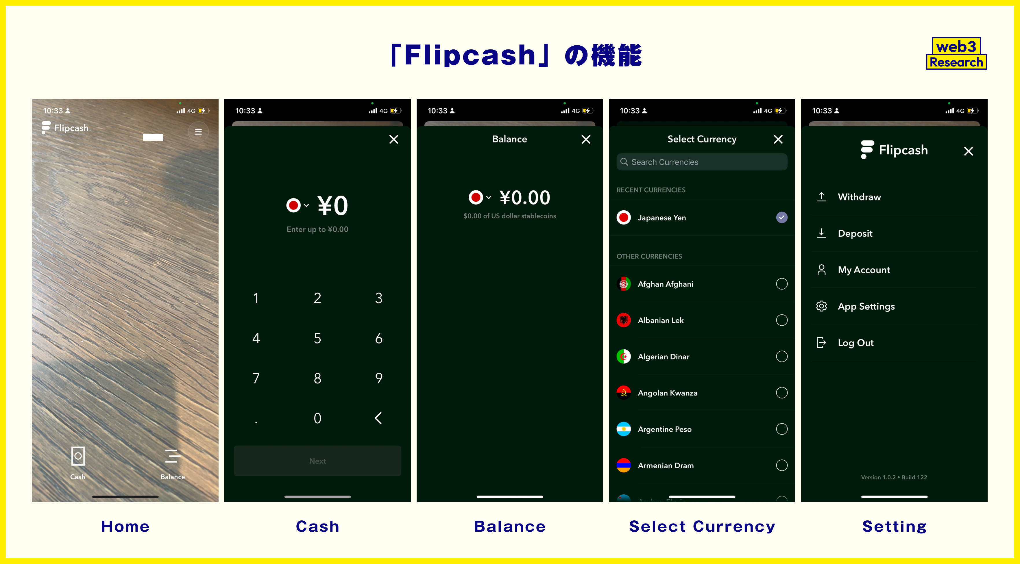 Simple UI: The application screen is extremely simple, centered around two buttons, "Cash" and "Balance.The screen structure of the application is extremely simple, with two main buttons: "Cash" and "Balance.The app is designed to be as easy to use as cash, in that anyone can operate it intuitively and it does not require complicated wallet address entry or knowledge of cryptography.