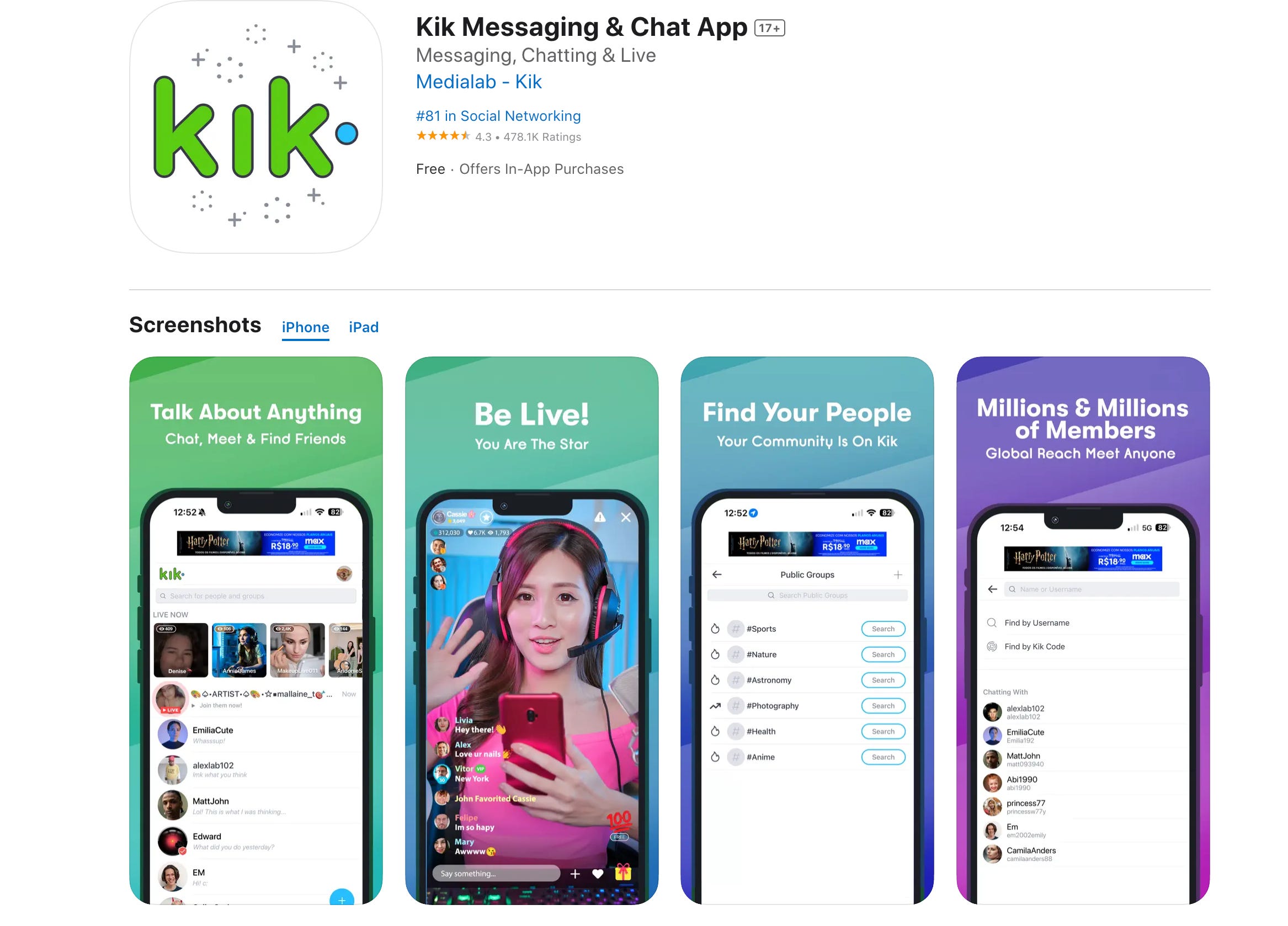 Kik Messenger is a free chat application for smartphones and a platform for text messaging, photo and video sharing, and bot interaction.It is characterized by the fact that anonymous accounts can be created with only an email address and name, without the need to register a phone number, and was popular among younger users who value their privacy.