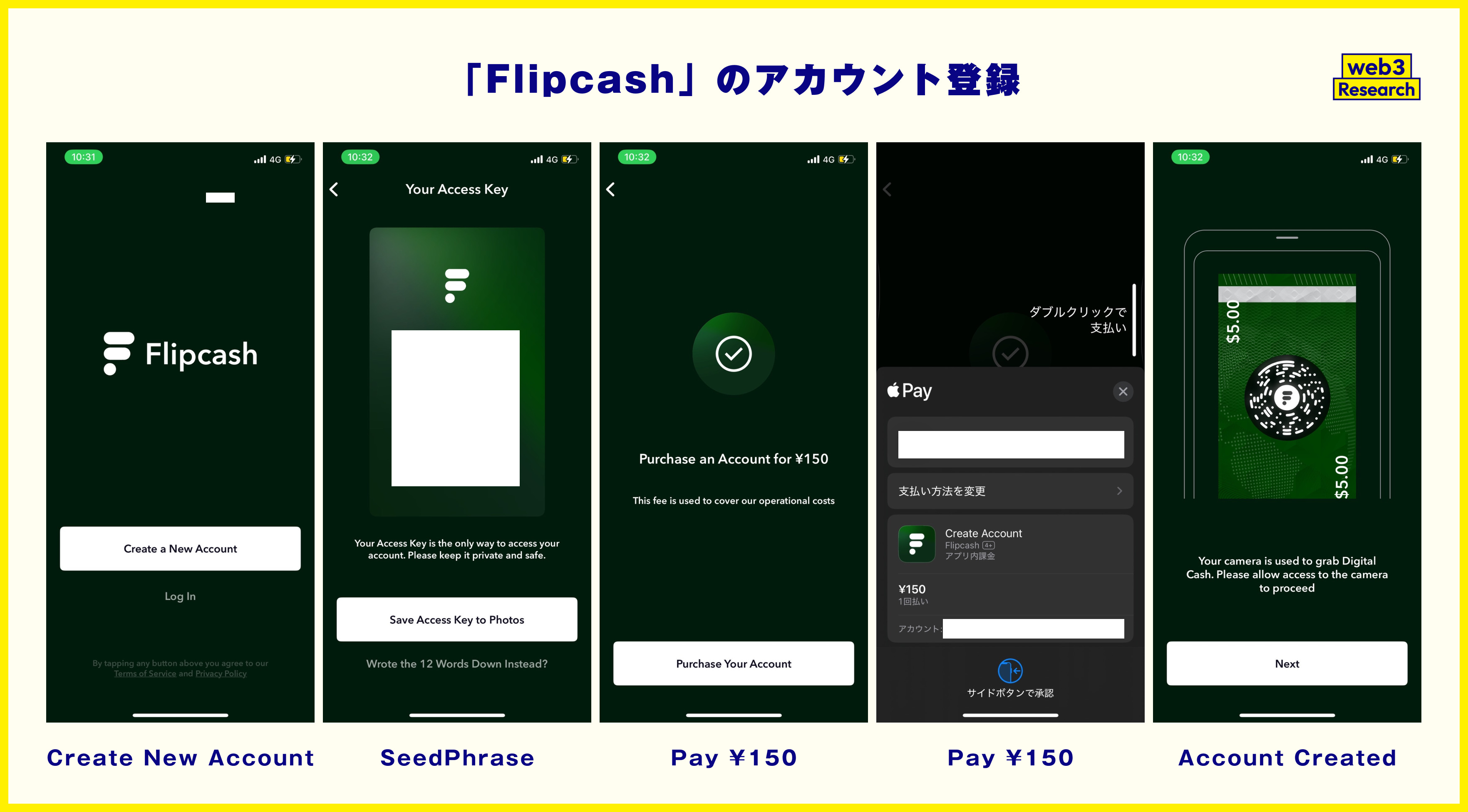 First is the account registration screen, where you are presented with a seed phrase just like a typical wallet.The unique thing is that there is a $150 fee when you register an account; I was able to pay directly from Apple Pay.(Initially, this seemed to cost about $20 and USDC would be given for that, but I downloaded it now and it only charges a fee of about $1.00.)