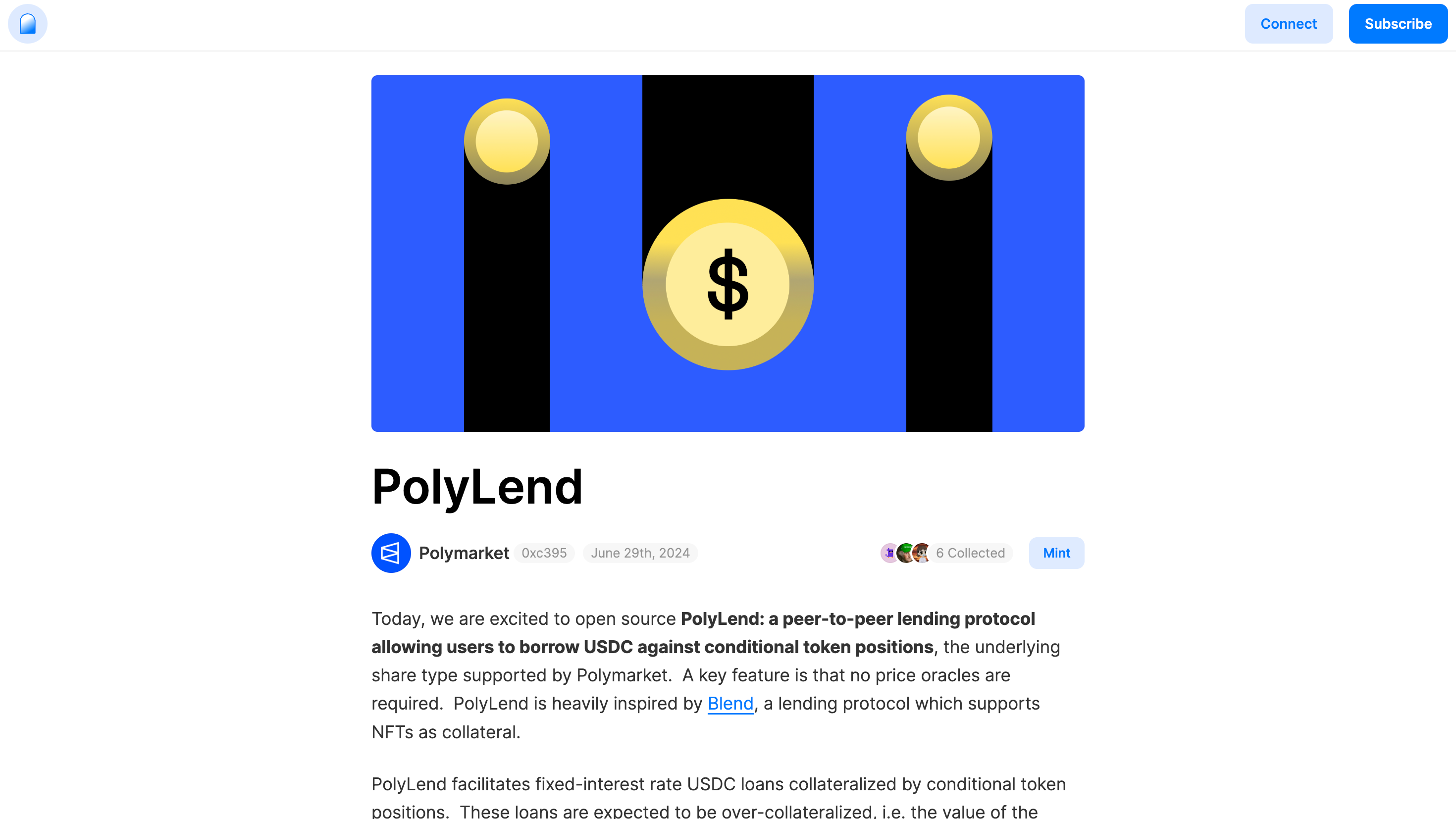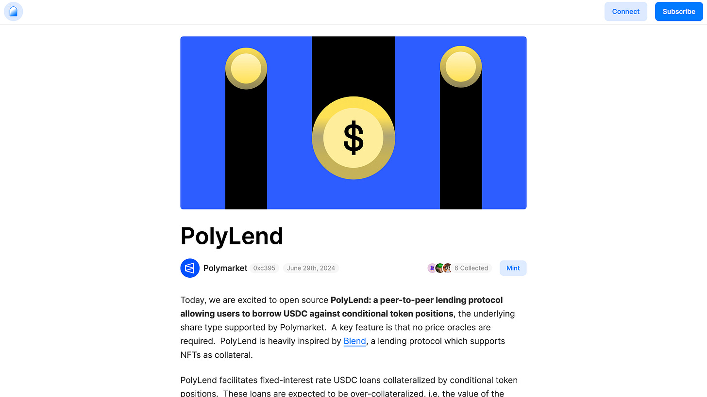 Polymarket also published a blog titled PolyLend in June 2024, reporting on the implementation of a PoC in this area and open sourcing the idea and code details.