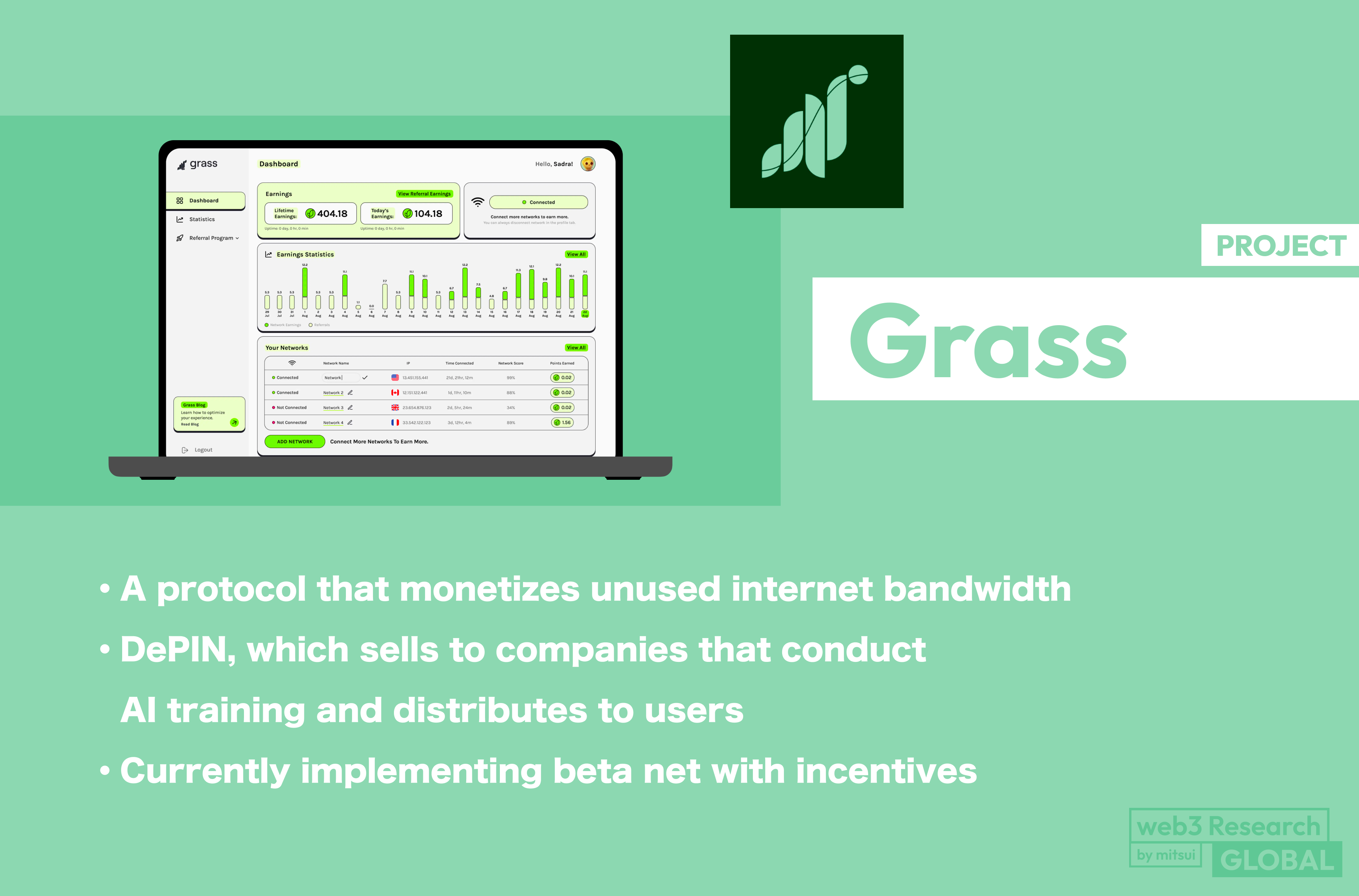 【Grass】 A protocol that monetizes unused internet bandwidth / DePIN, which sells to companies that conduct AI training and distributes to users / Currently implementing beta net with incentives
