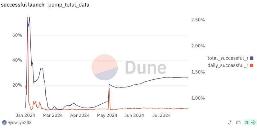 However, of the 1.58 million tokens issued by Pump.fun, only 22,330 tokens made it to the Raydium listing.In percentage terms, the success rate should be 1.4%.%