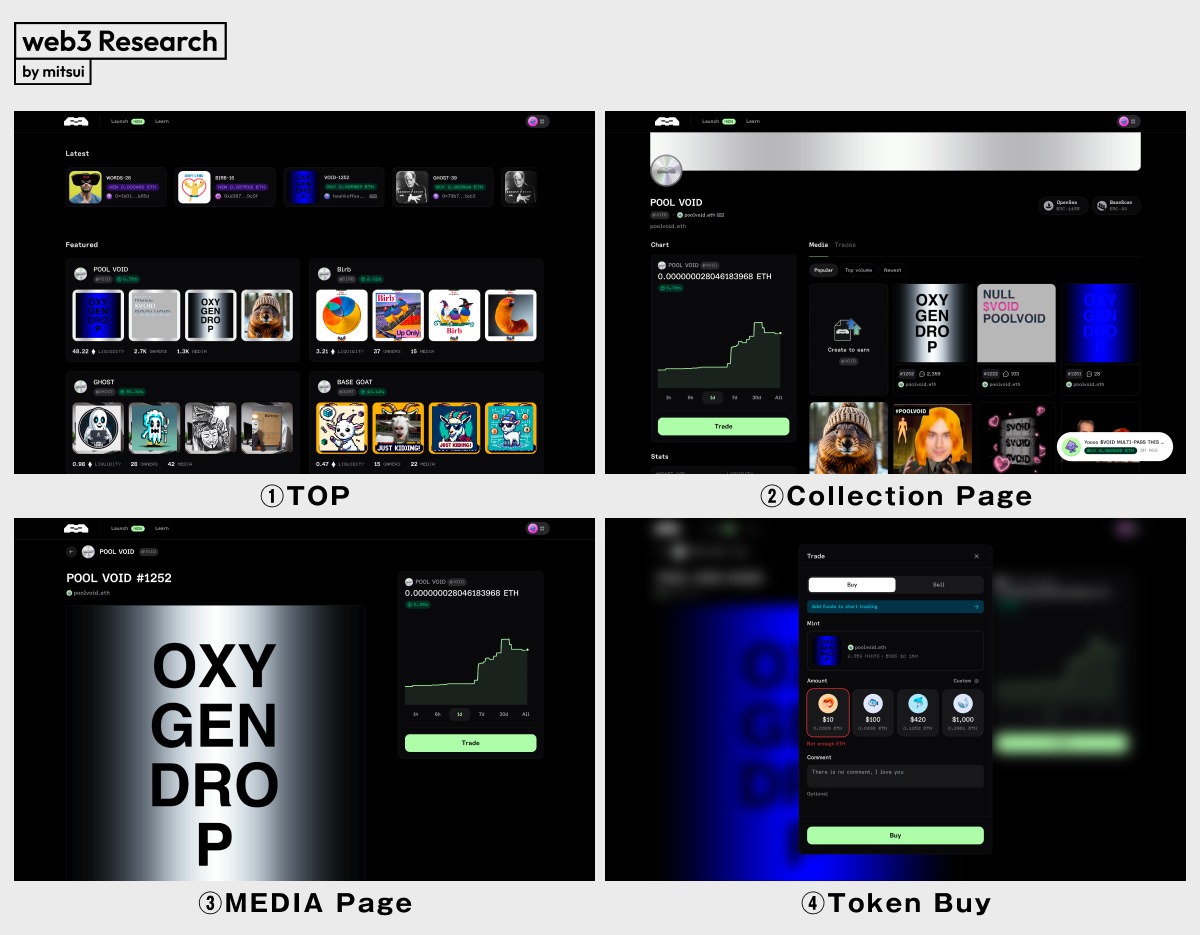 The token purchase flow is as follows ①-④. The key point is that "you need to purchase one media associated with the token at the time of purchase". Each collection page displays a list of media, and you select one media from there to purchase the token.
