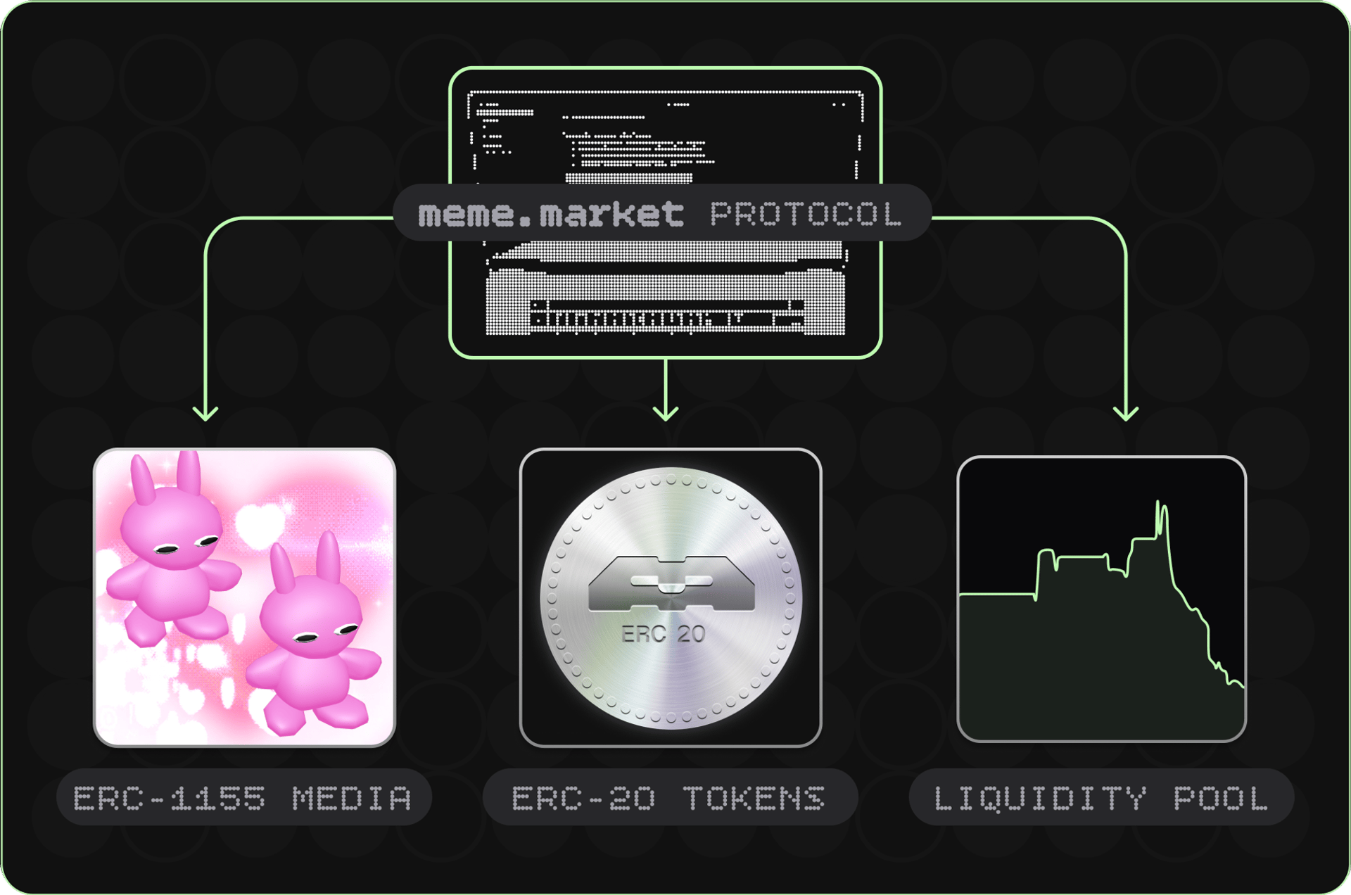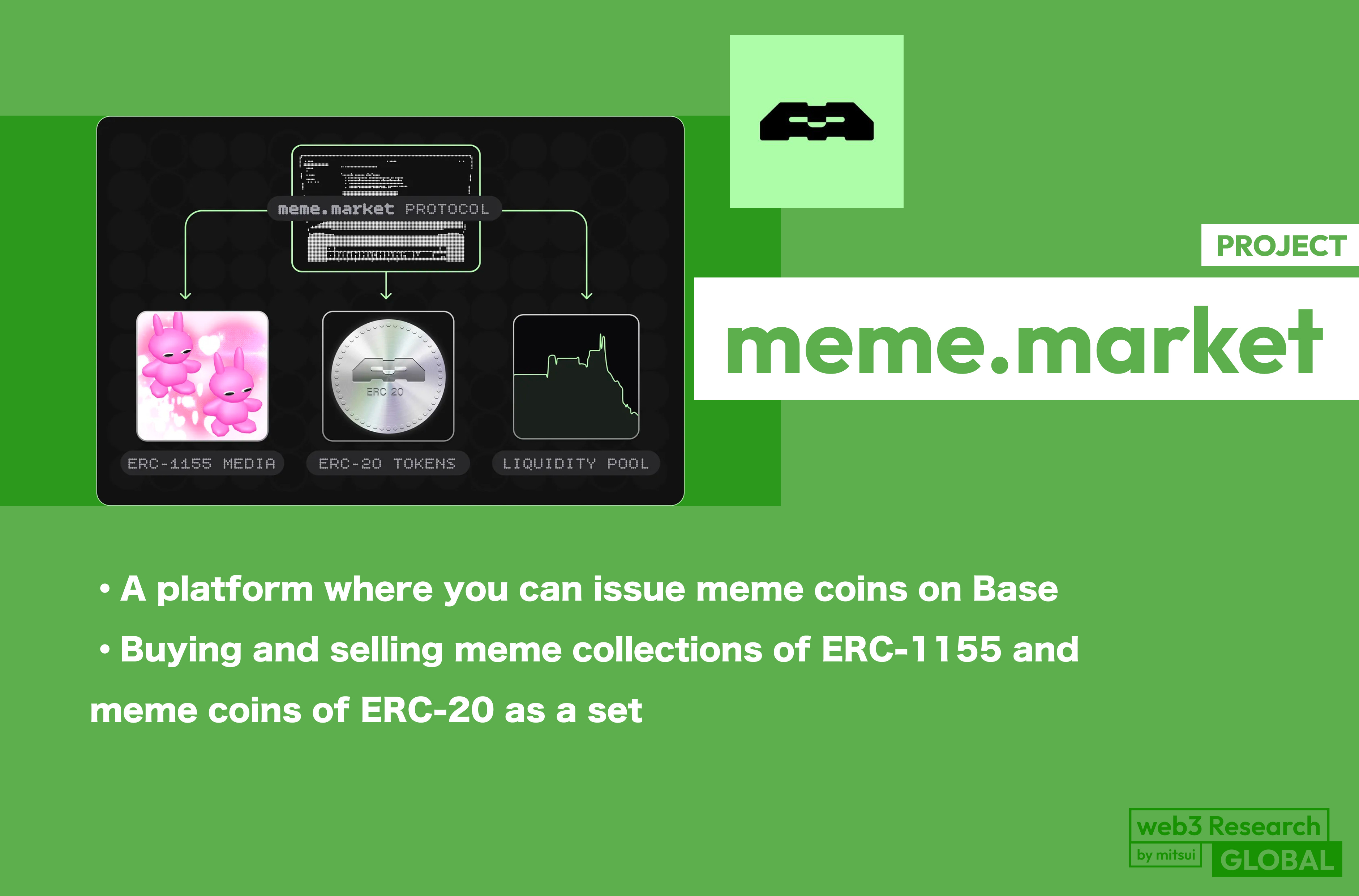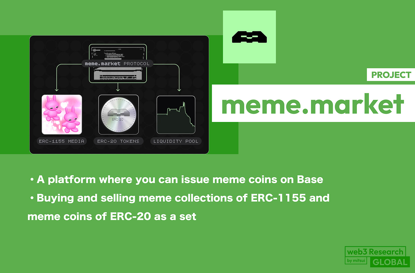 "meme.market" is a platform where anyone can issue meme coins on the Base chain. Not only can you simply issue tokens, but it also adopts an innovative mechanism where ERC-20 meme coins and ERC-1155 meme collections are sold in sets.