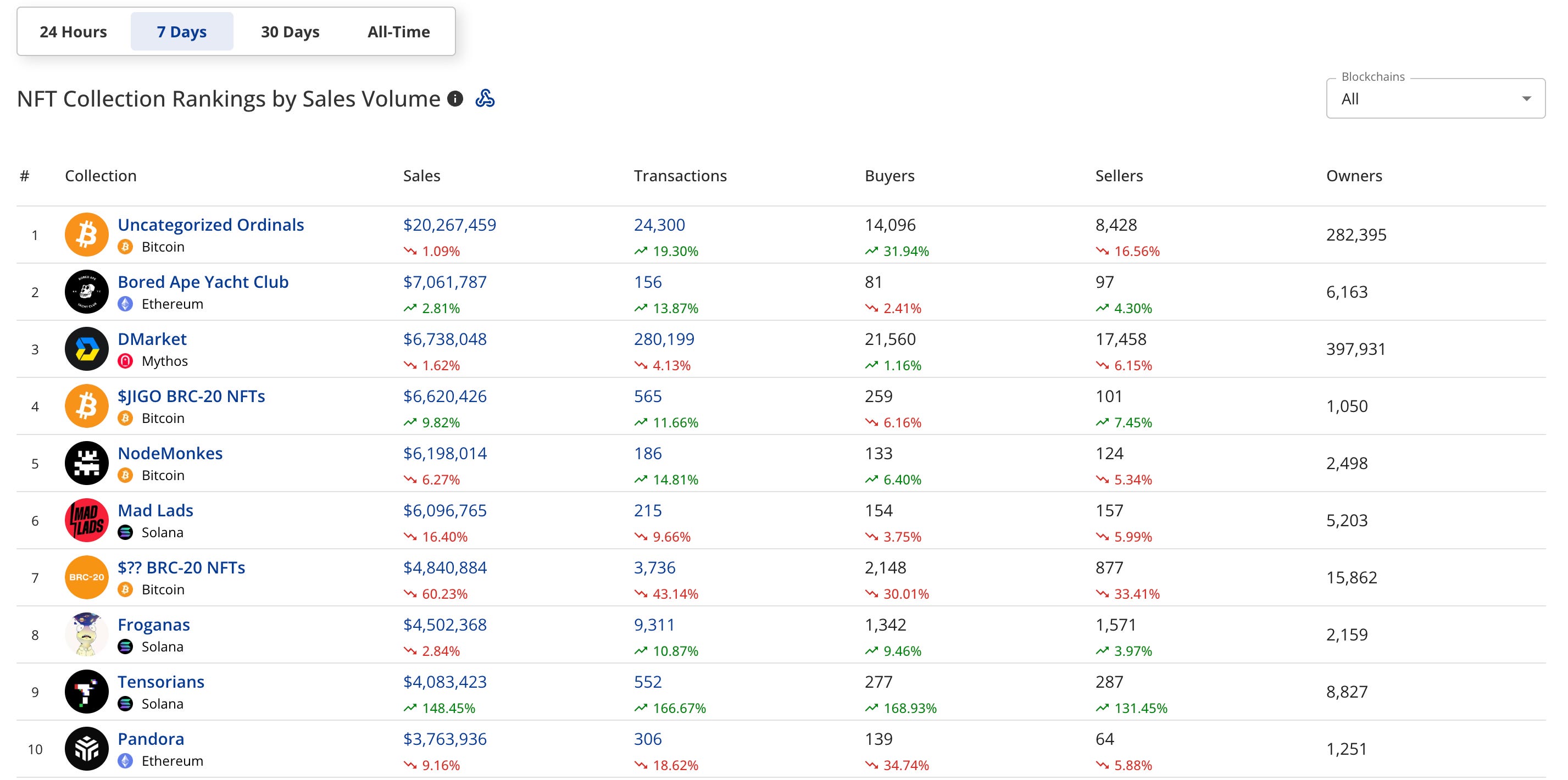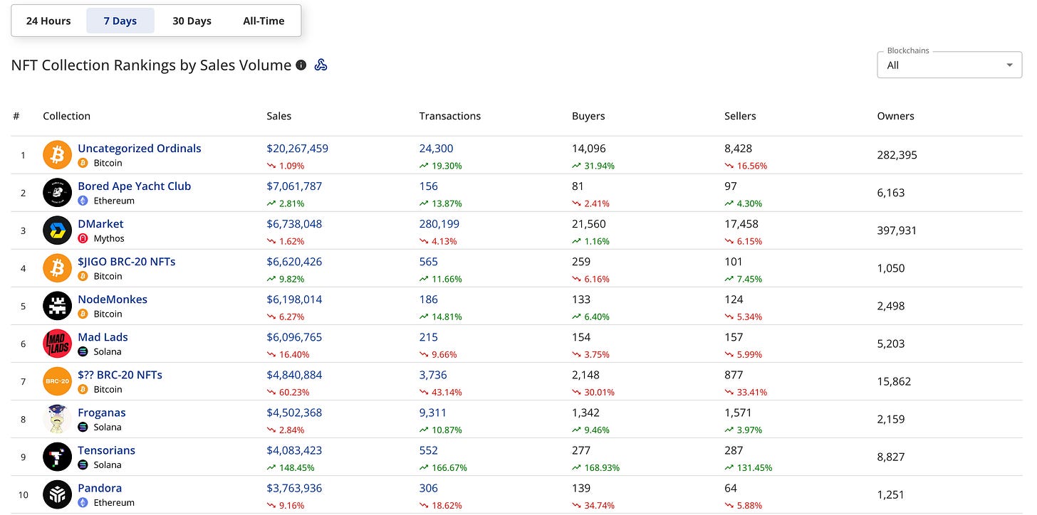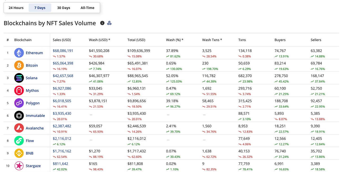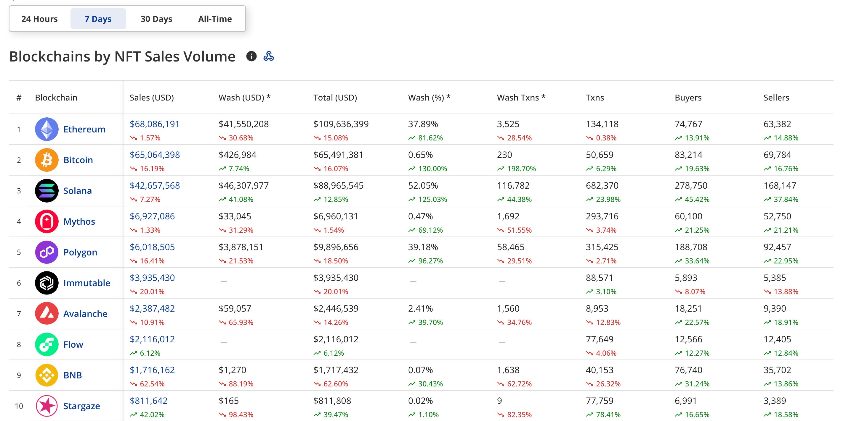 Market volume is down 9.95%. However, the total number of transactions is up 15%, so it does not appear that the market is falling. Notably, Bitcoin was #1 for a while in NFT transactions by blockchain, but it has returned to Ethereum after a long time. Then there is a chain called Stargaze that is growing rapidly, coming in at #10.