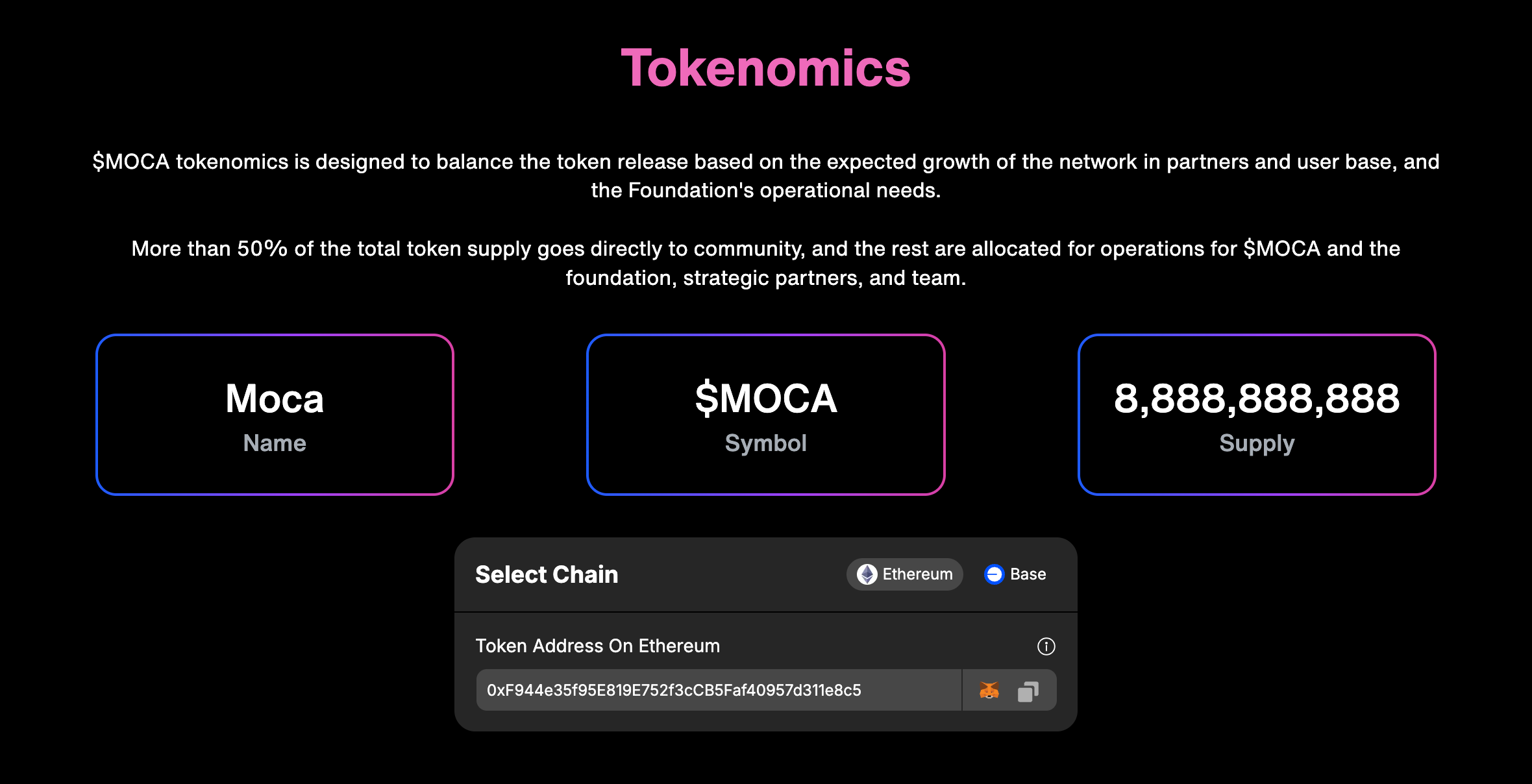 And $MOCA is a utility and governance token used throughout the Mocaverse, Moca Network and MocaChain. 8,888,888,888 tokens are issued, mainly Ethereum and Base, but with the use of Layer0, it is multi The main focus is on Ethereum and Base, but it can be deployed on multiple chains by using Layer0.