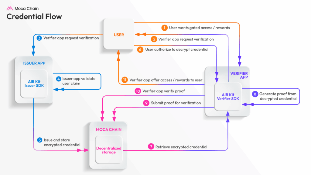 Traditionally, user data has been distributed and siloed across services, making it difficult to reuse and dependent on a centralized administrator; MocaChain stores user credentials on the blockchain and in peer-to-peer distributed storage, which users control with their own cryptographic keys. MocaChain keeps user credentials on the blockchain and in peer-to-peer distributed storage, controlled by the user's own cryptographic key.