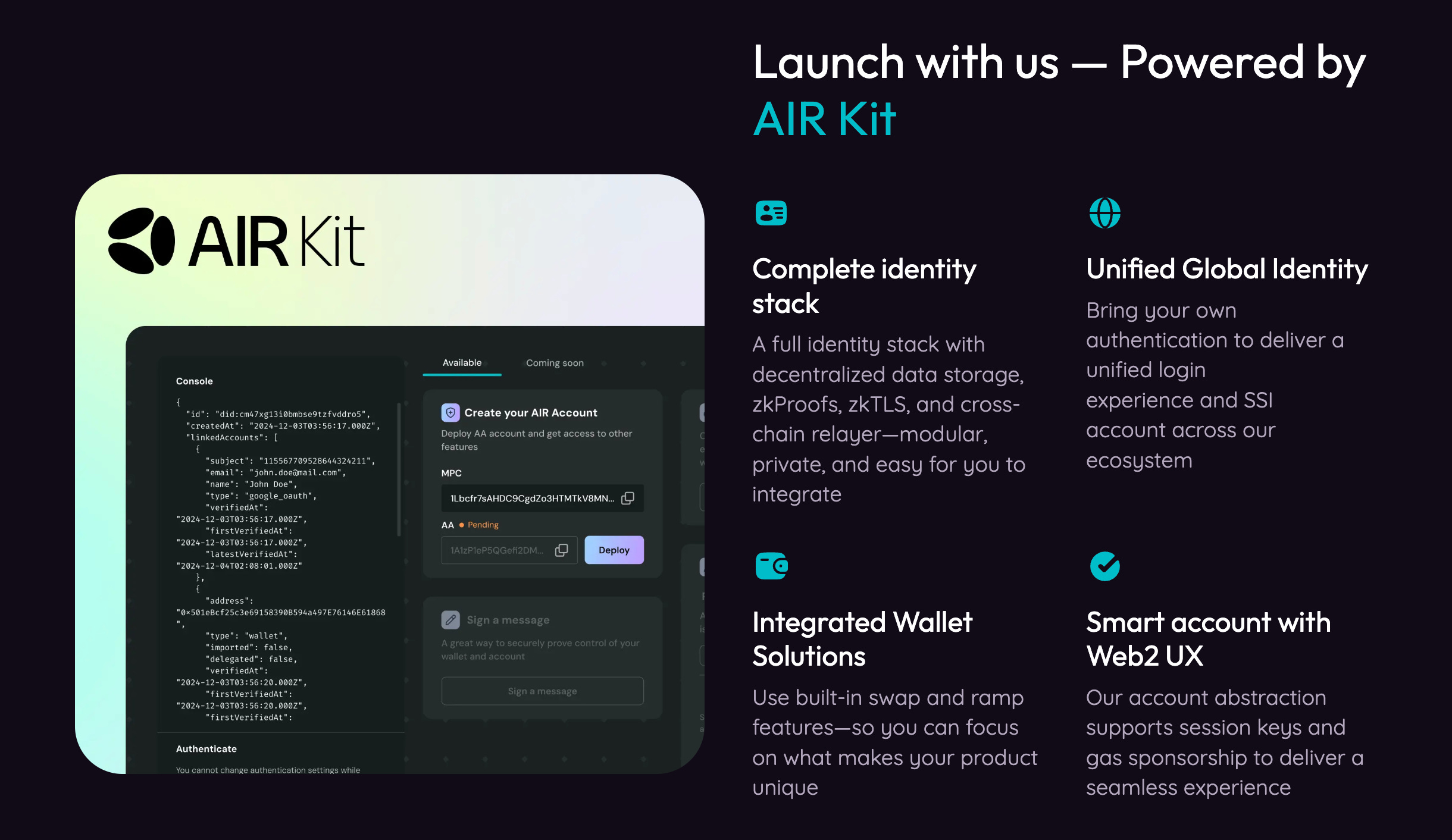 AIR Kit, which stands for "Accounts, Identity, Reputation," was offered as a developer toolkit integrating account management, ID issuance, and reputation scoring modules.
