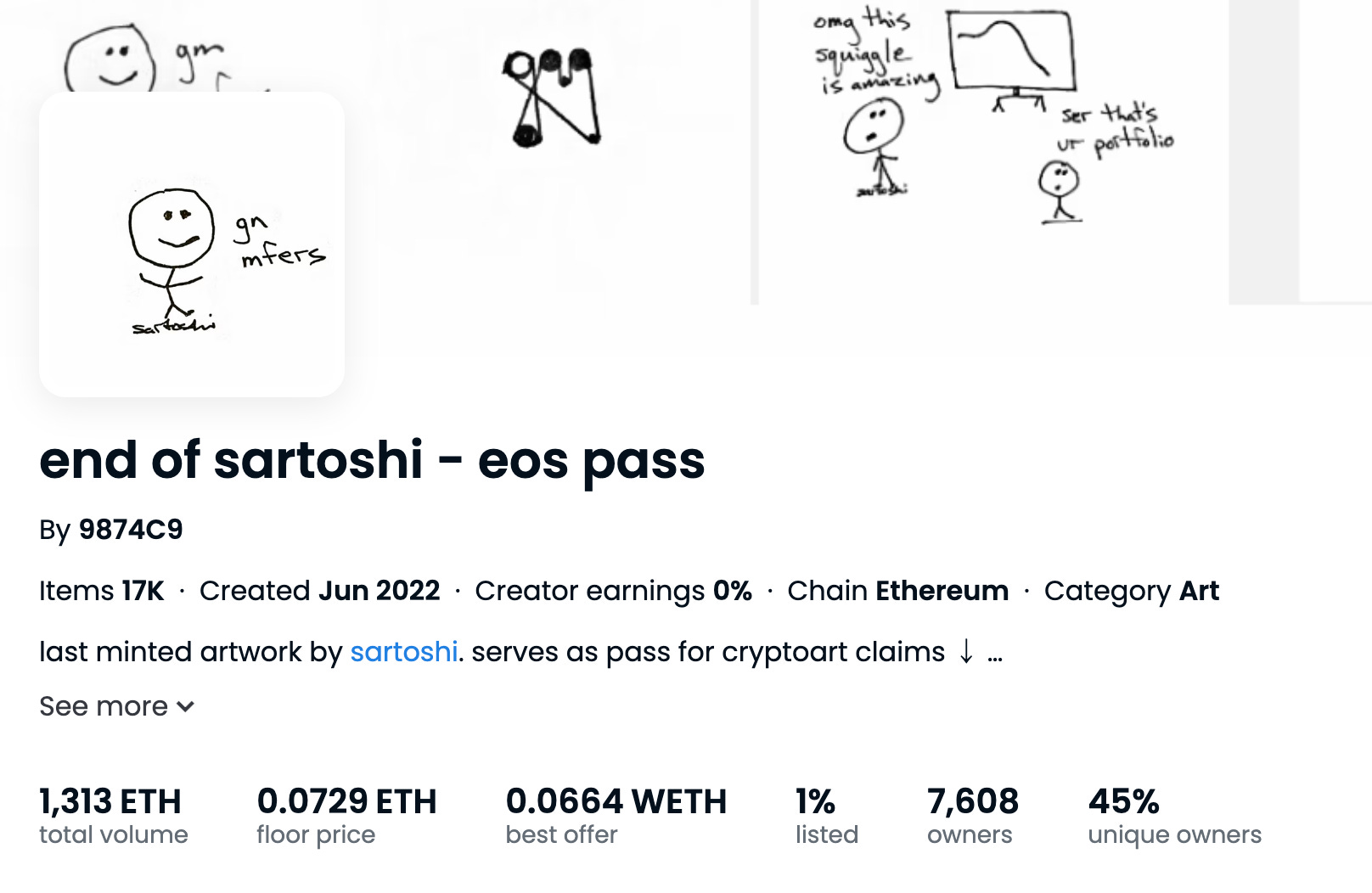 The NFT collection he created at the time of his departure is "end of sartoshi - eos pass.