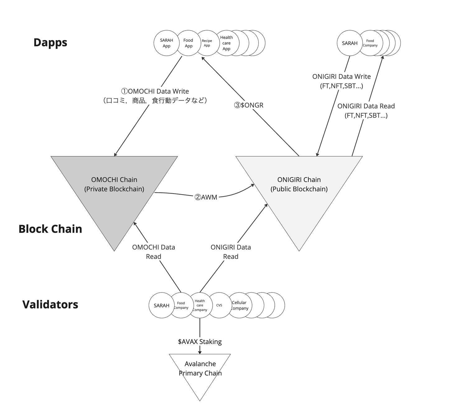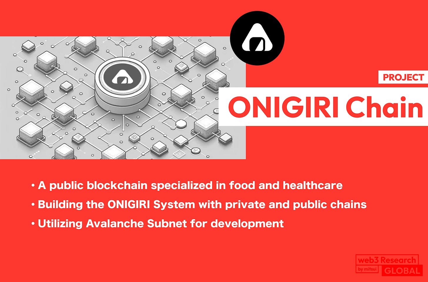 "ONIGIRI Chain" is a public blockchain specialized in food and healthcare. It is a unique blockchain developed by SARAH Co., Ltd., which develops gourmet app "SARAH," utilizing Avalanche Subnet.