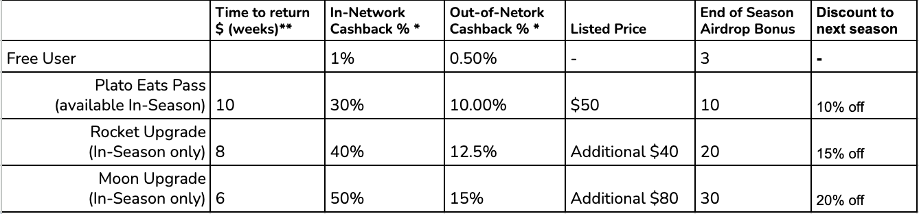 Below is a table of Plato Eats Pass prices and cashback percentages, starting at $50 and upgradable for an additional $40 or $80.