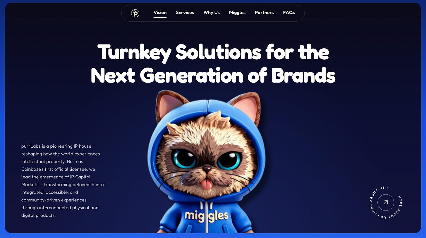 【purrLabs】Advancing "IP Capital Markets" as Coinbase's First Official IP Licensee / Supporting IPs like Mr. Miggles and Peach & Pablo / @purrLabs