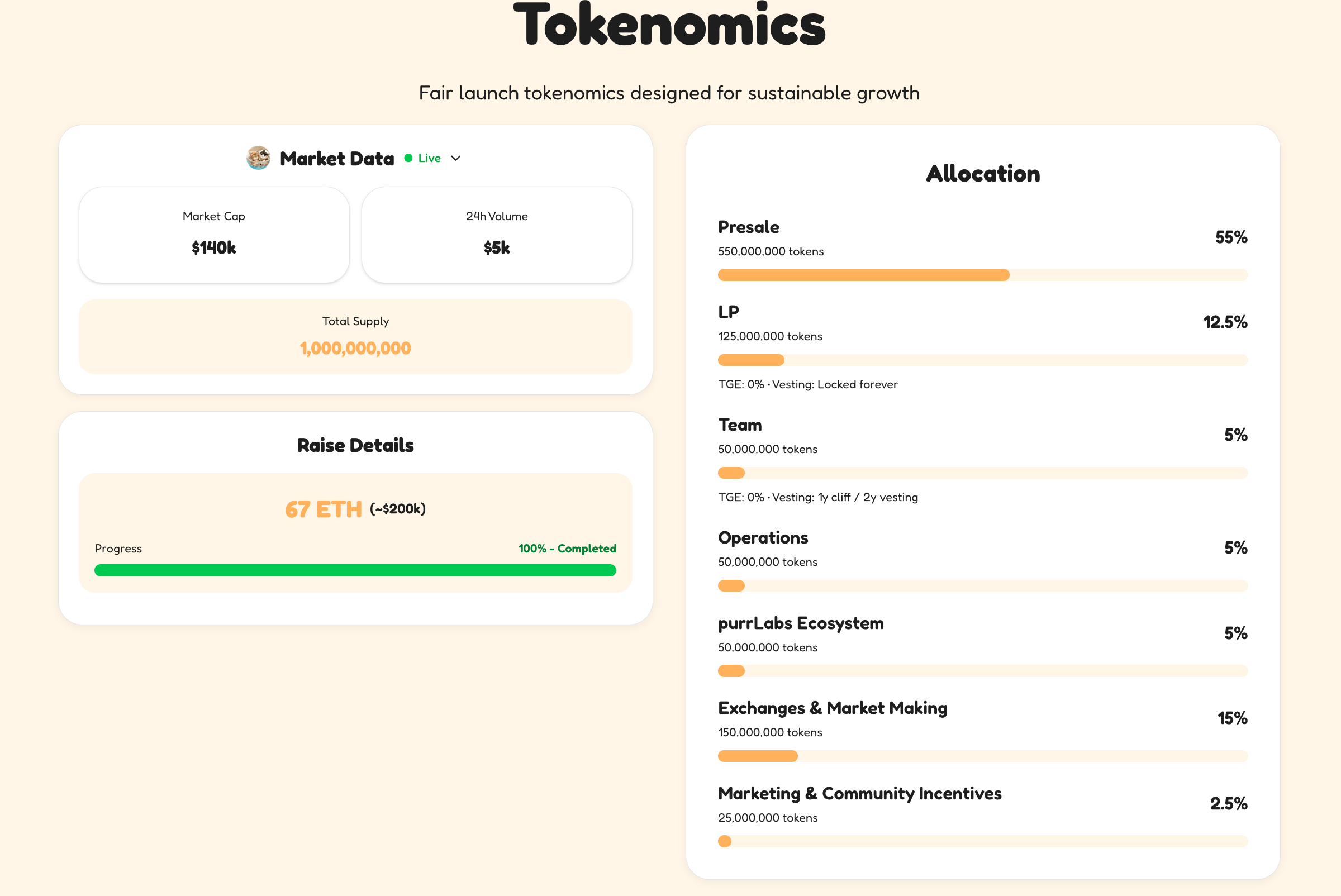 The token sale and distribution took place on the District.xyz platform in partnership with purrLabs, raising 67 ETH (approximately $200,000) while distributing 55% of the total supply (550 million tokens) to the market.