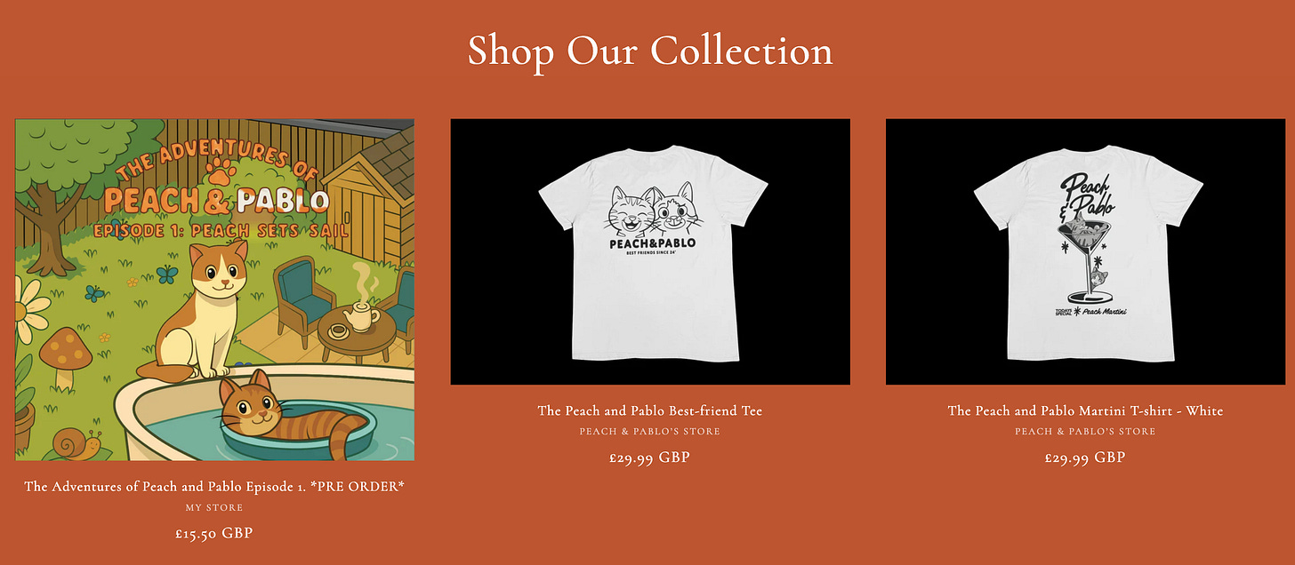 Peach & Pablo is a character IP modeled after two real rescue cats, born from their viral popularity in short-form video content on platforms like TikTok and Instagram.