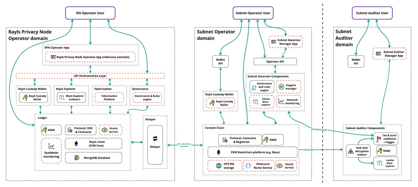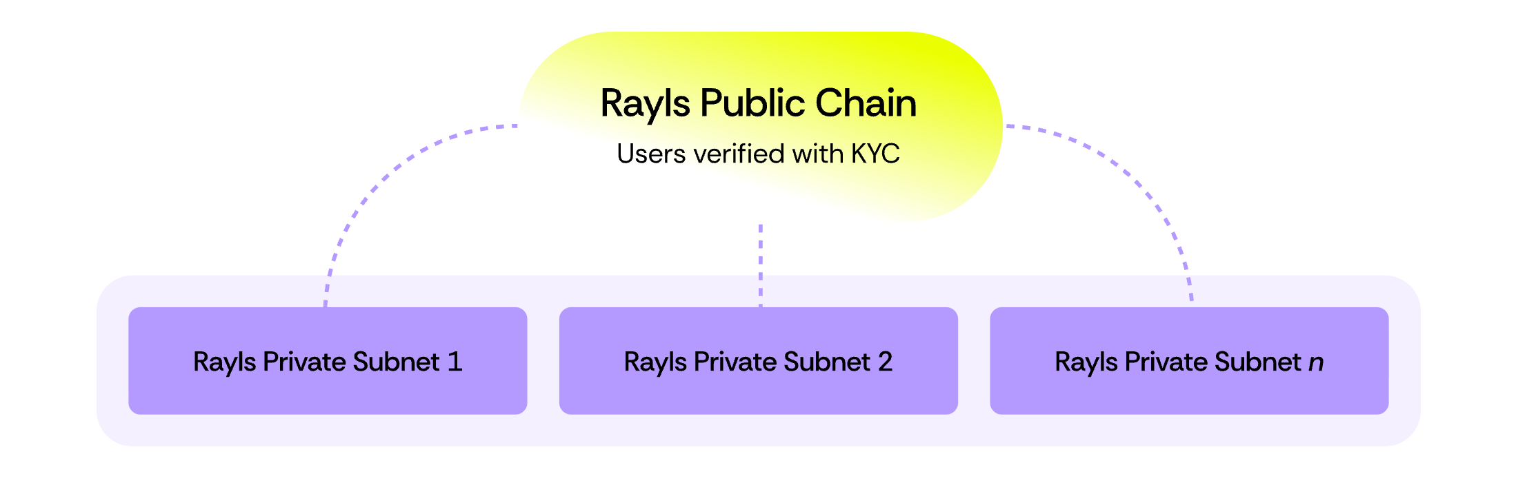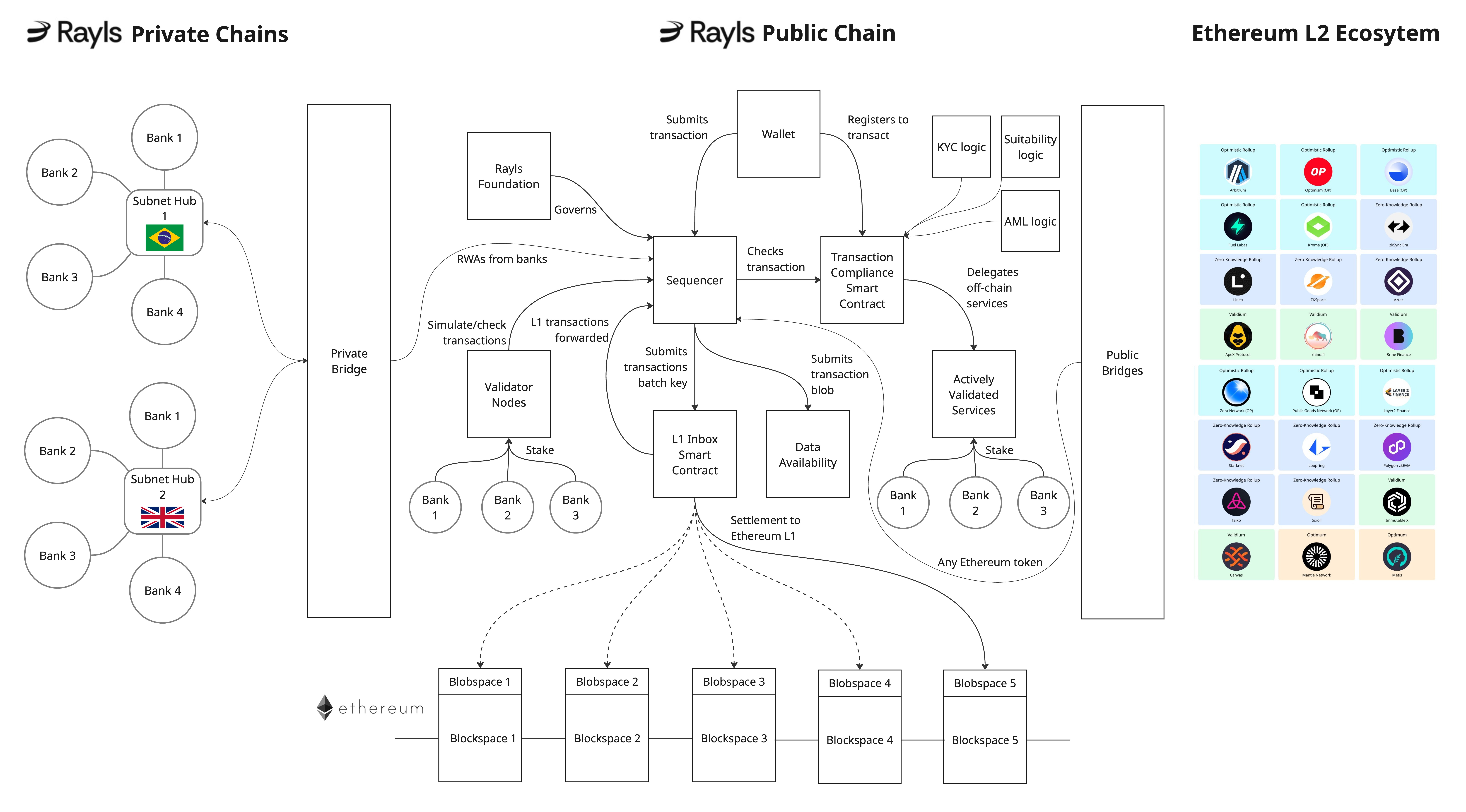 Rayls is an EVM-compatible blockchain ecosystem that integrates private (permission-based) networks with public chains. The network natively incorporates privacy protections, governance controls, and regulatory compliance (KYC/AML) to enable financial institutions and their customers to utilize blockchain technology in a secure and compliant manner.
