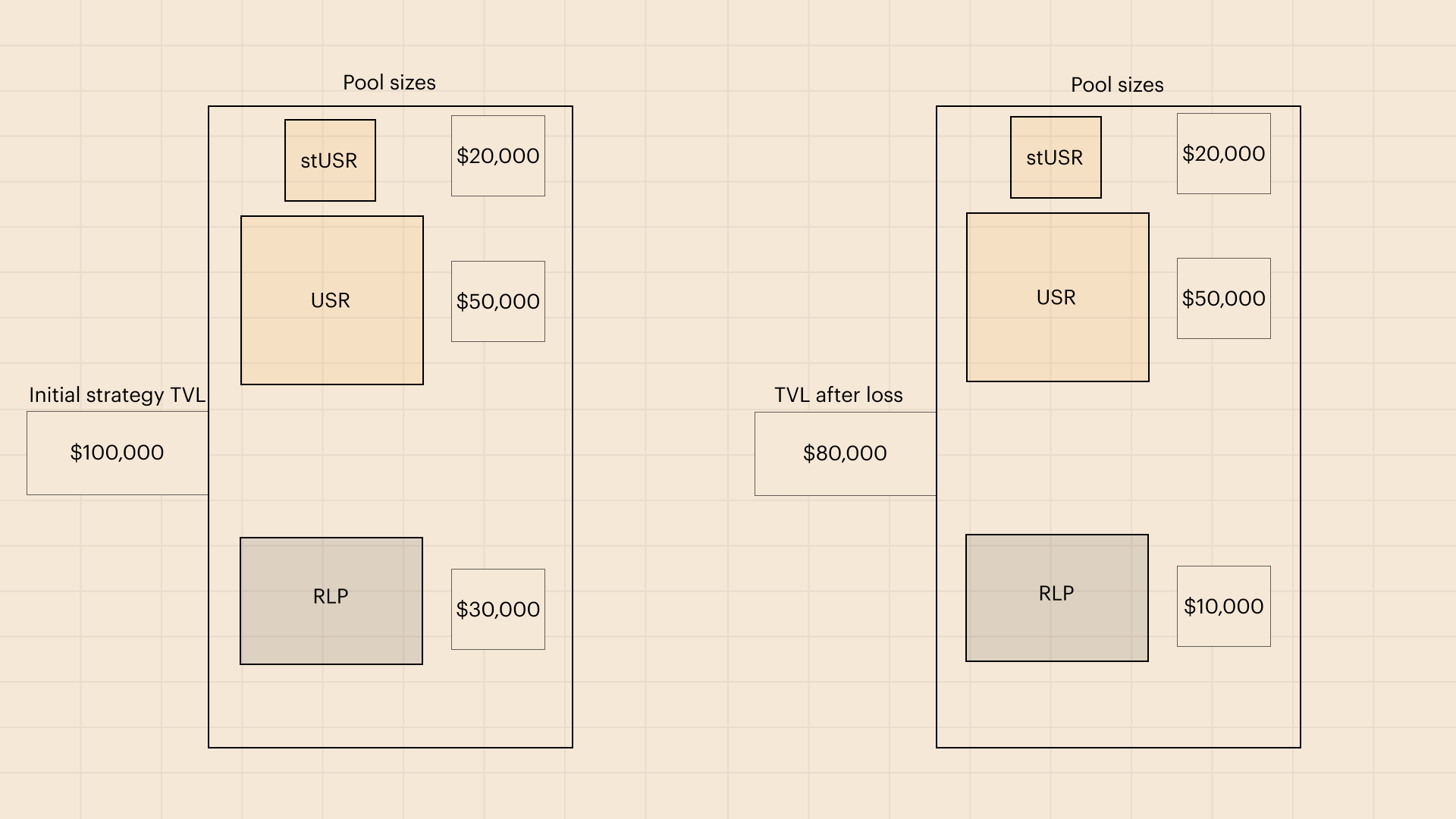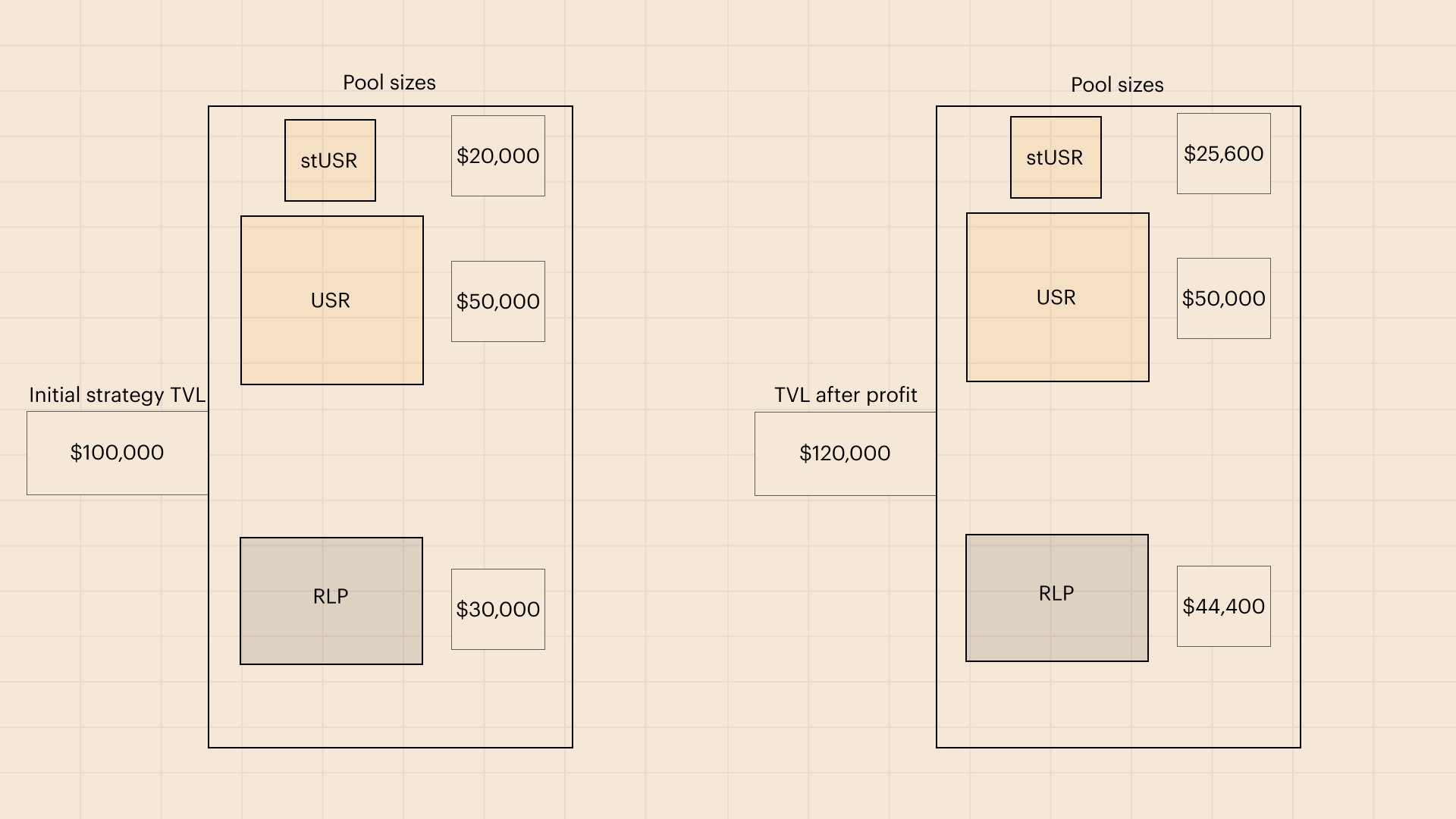 Let's look at a concrete example.Suppose $100,000 is deposited in the protocol, of which $70,000 is deposited in USR and $30,000 in RLP. $20,000 of the $70,000 USR is staked and stUSR is issued.