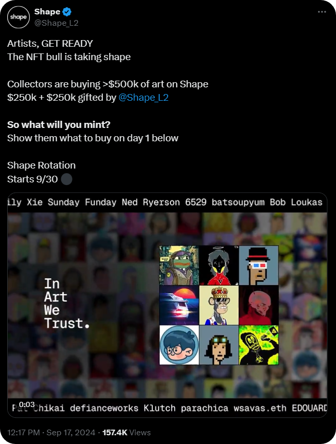 The main net launch campaign will be called Shape Rotation.This is an initiative in which more than 40 prominent NFT collectors will launch a $250,000 collection rush on Shape NFT, with the Shape team donating an additional $250,000 for every purchase.