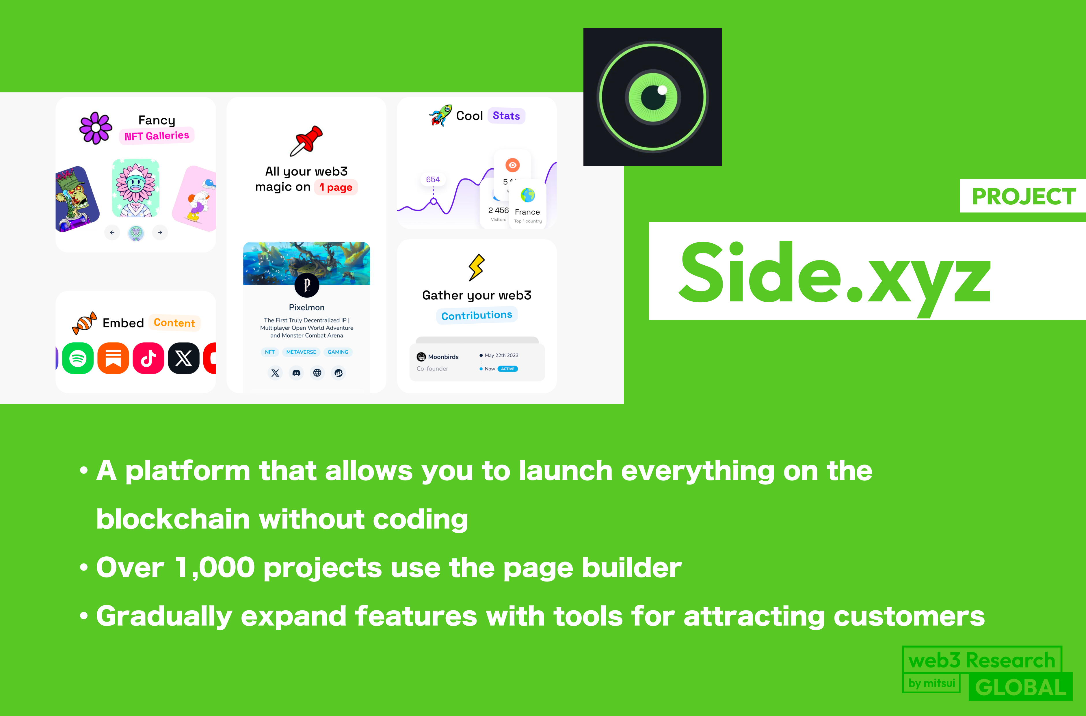 "Side.xyz" is a platform that allows you to launch any project on the blockchain with no-code. It is said that it is possible to realize everything from creating pages like linktree, minting tokens and NFTs, DEX integration, DAO construction, and implementation of staking with no-code.