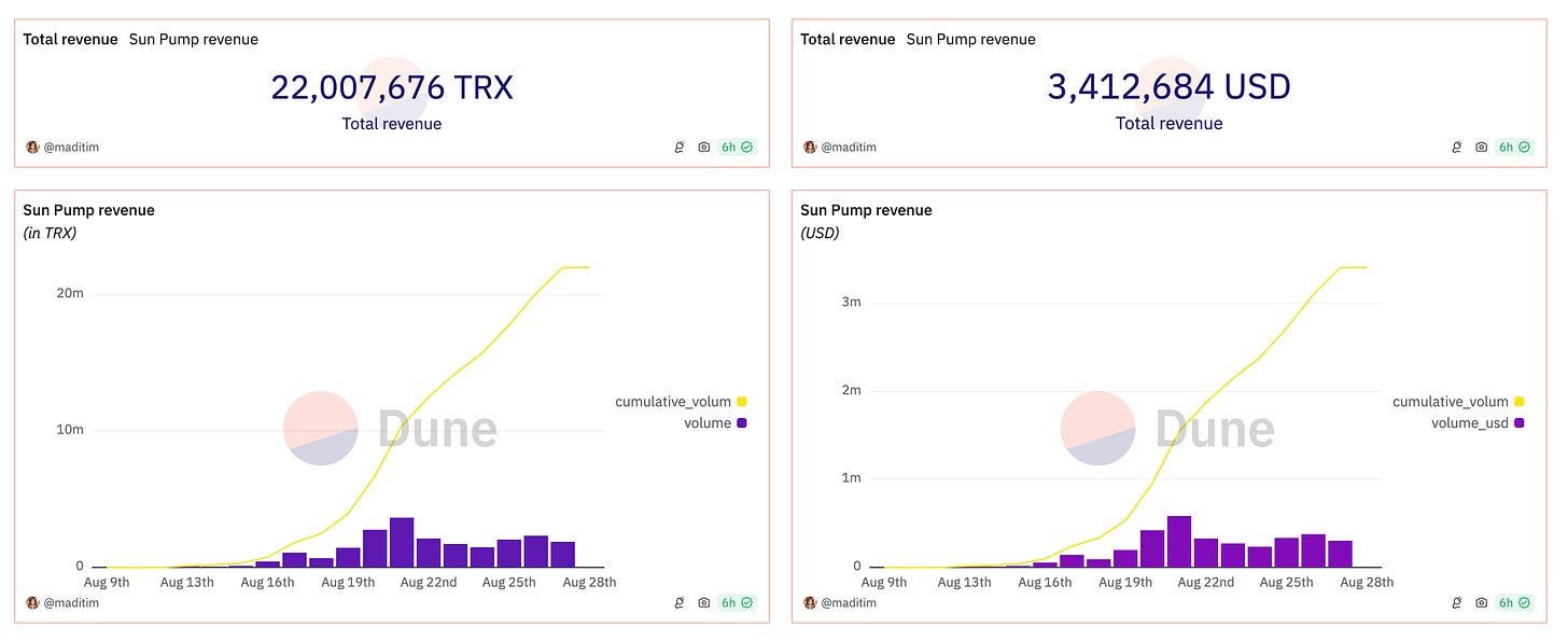 Sun Pump was released on August 9 and has grown rapidly from there.On August 21, 12 days after its release, 7,531 tokens were issued in 24 hours, exceeding both the number of tokens issued and the fees Pump[...].fun was exceeded.
