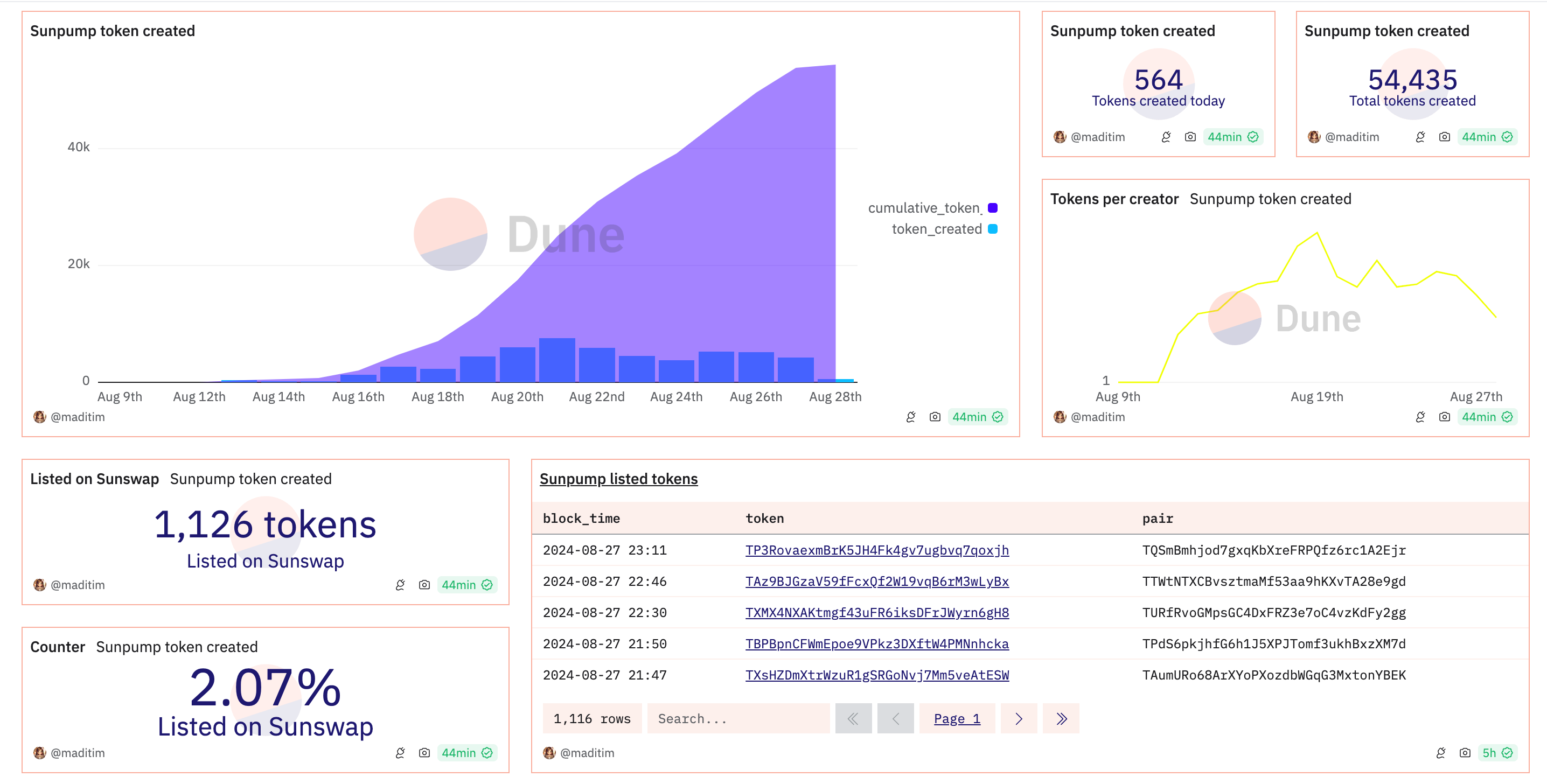 The momentum has slowed somewhat, but it is still going strong, with a cumulative total of 54,435 tokens issued.The number of tokens that have reached Sunswap is 1,126 tokens, or 2.07% of the total.
