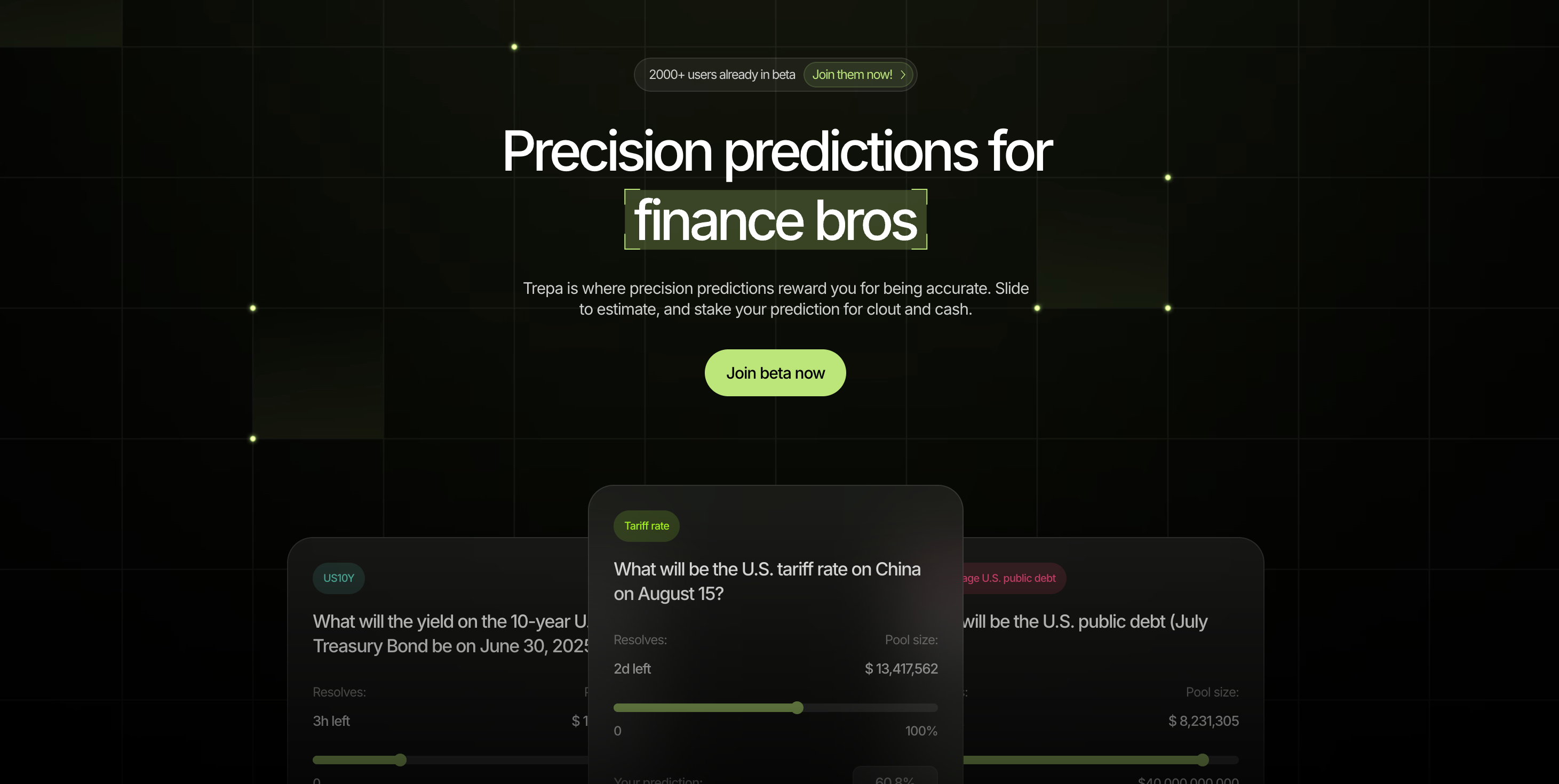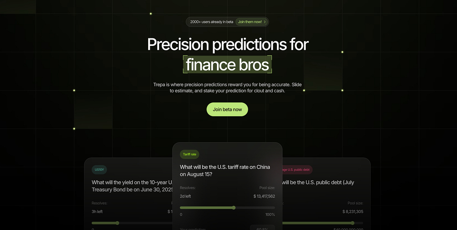 Trepa is a precision forecasting platform specializing in numerical forecasts. Users can post numerical forecasts on economic indicators such as inflation rates and government bond yields and earn rewards based on the accuracy of their forecasts.