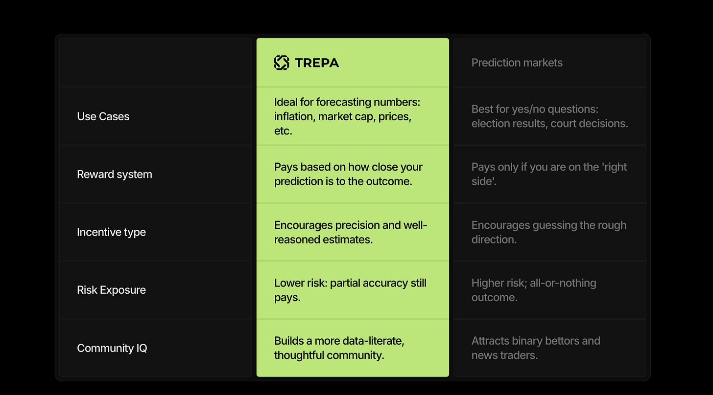 In short, Trepa aims to form more intelligent and practical collective knowledge by introducing a low-risk, accuracy-oriented mechanism, as opposed to the "high risk, low accuracy, and strong gambling nature" of the traditional forecasting market.