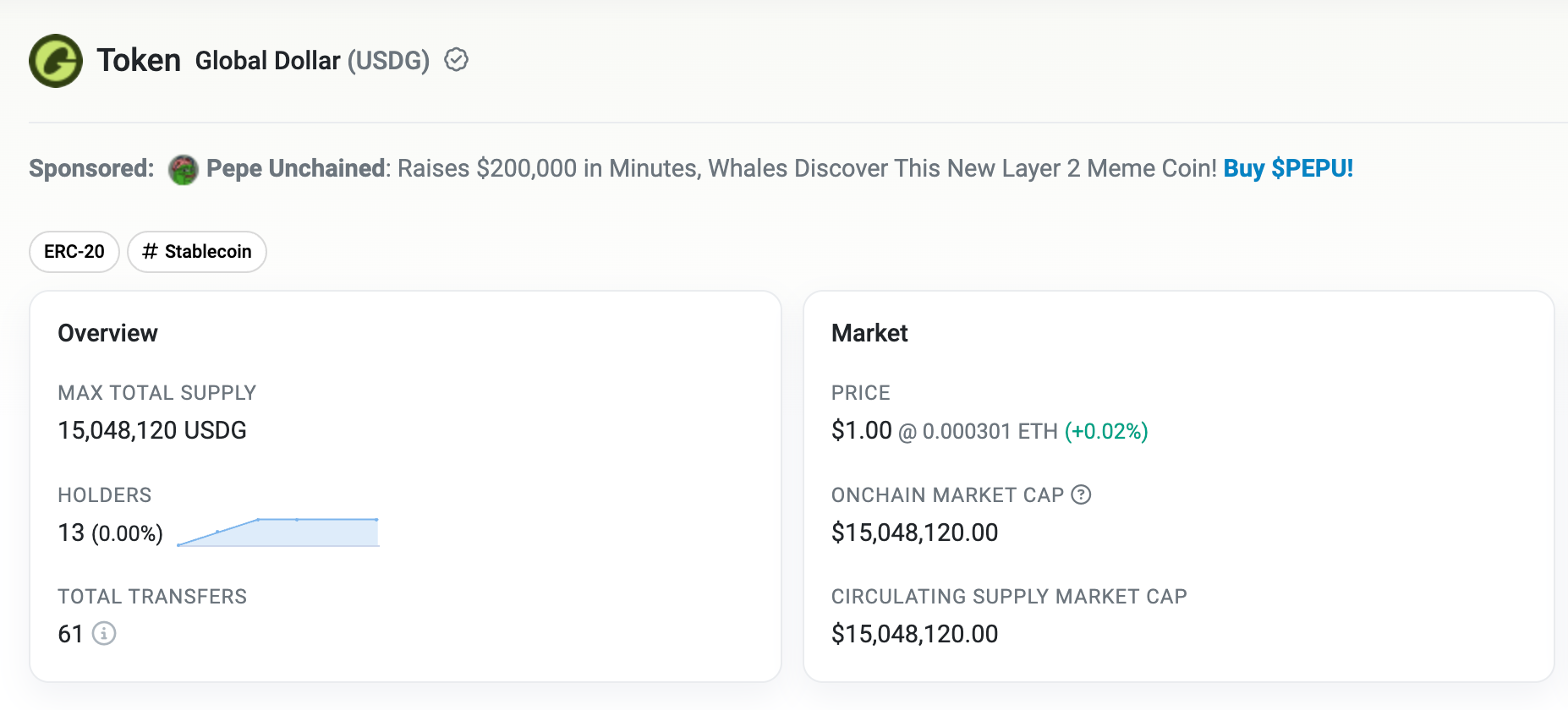 USDG was announced on November 4, 2024.At the time of research, 15,048,120 USDG has been issued, although it is about 2 weeks old.