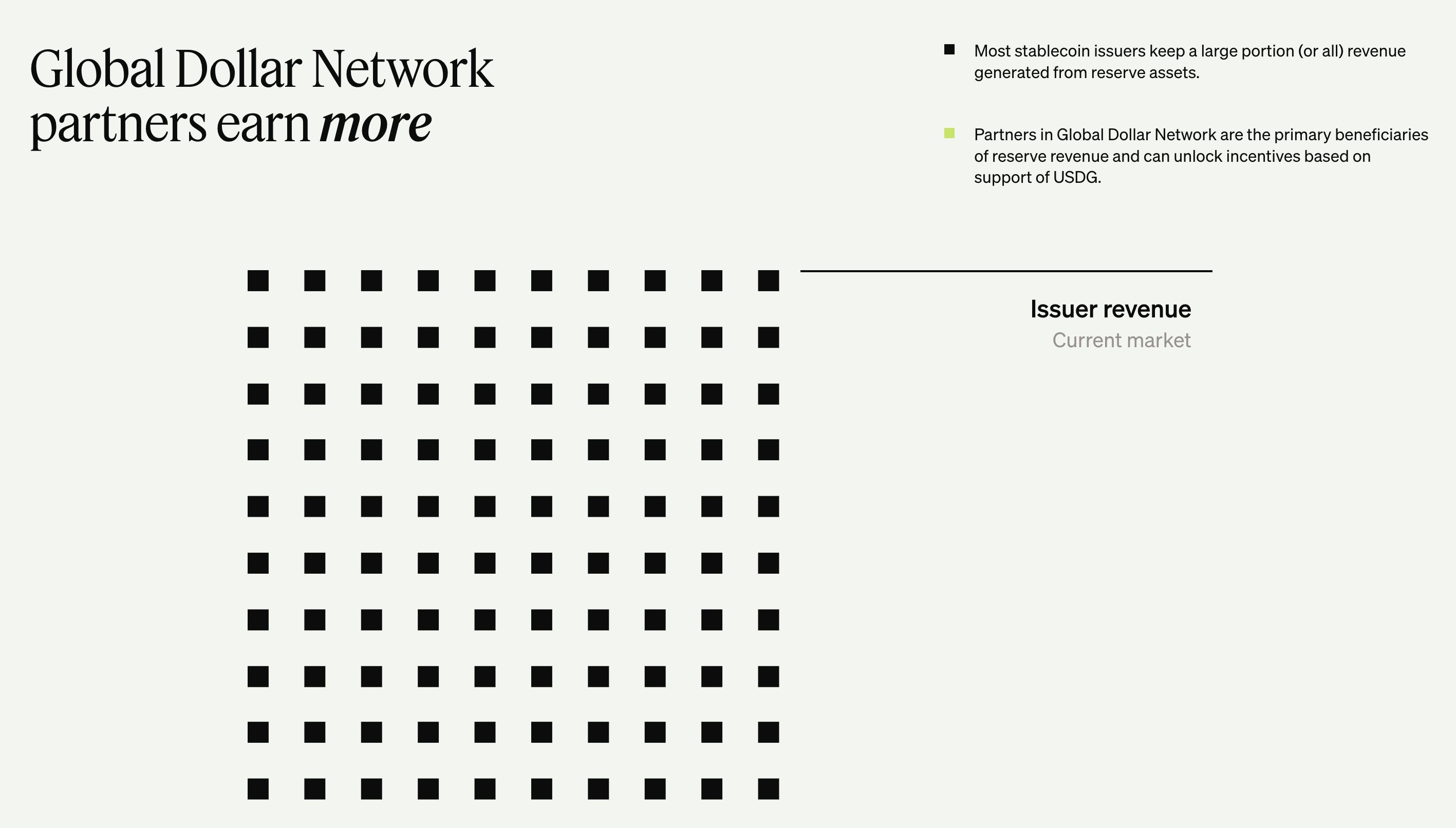 Global Dollar Network, on the other hand, partners receive up to 100% revenue sharing.They also receive additional earnings on USDG mints and redemptions.
