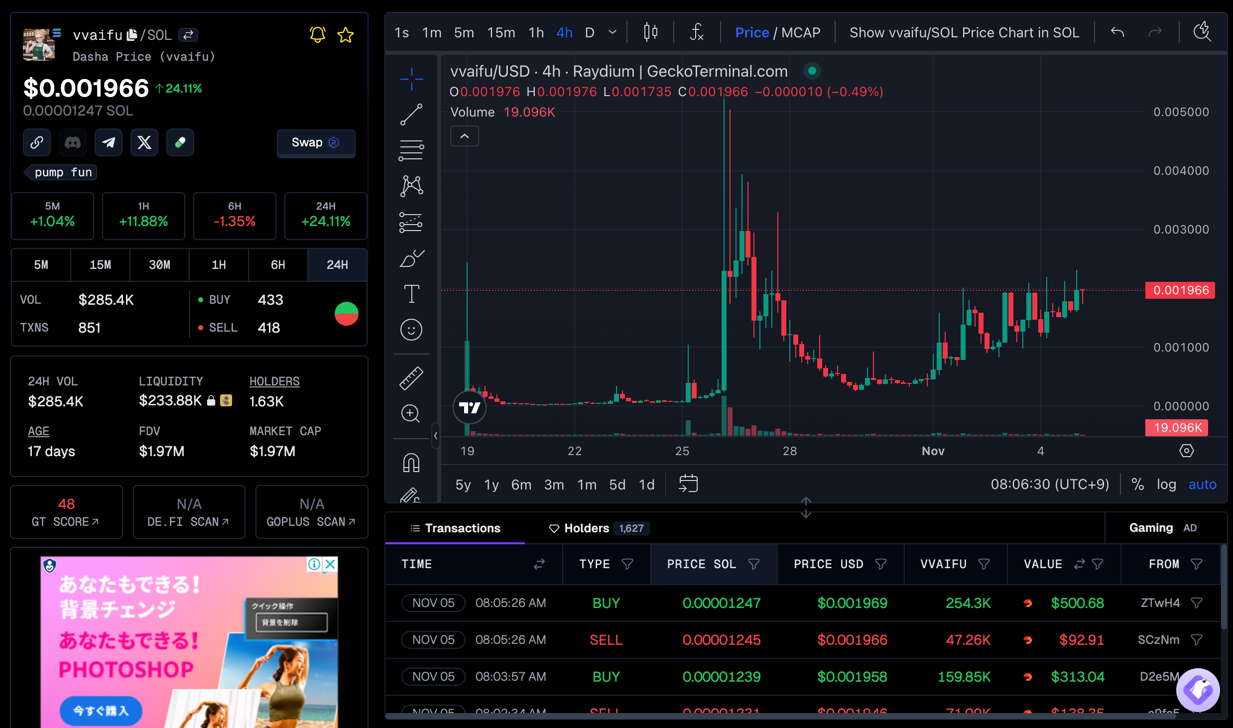 The token itself was launched 17 days ago with 1.63K holders and a current market cap of $1.97M.The market cap of $1.97M is quite high.