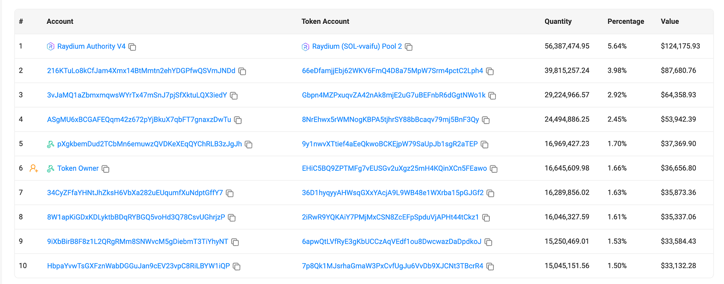 All $VVAIFU tokens are in the market, but the burn mechanism has been implemented, so the token price should rise as circulation decreases, demand for the platform increases, and the AI agent itself becomes more famous and buzzy.We expect that price increase.
