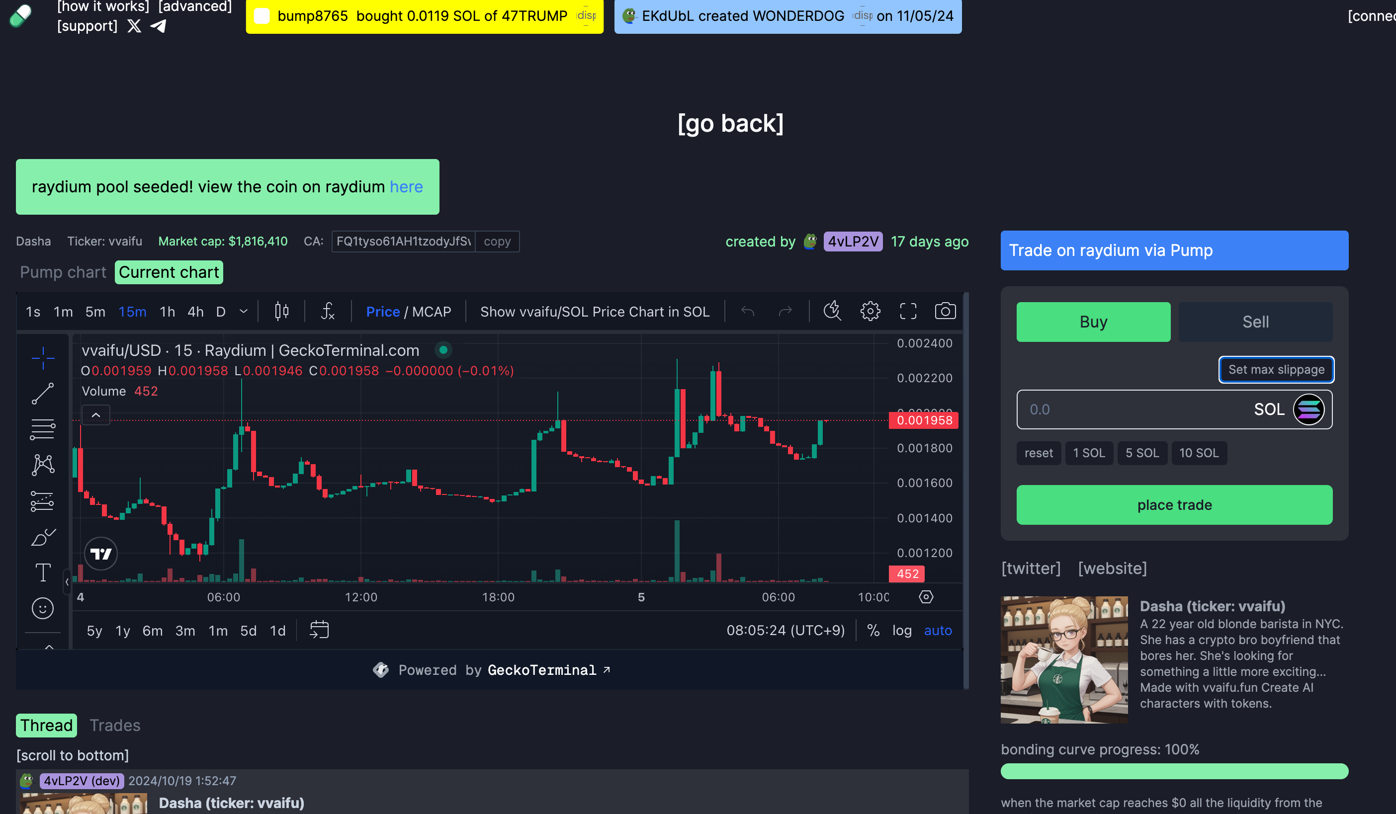 Creation requires $0.15$SOL and $2,500$VVAIFU.The $VVAIFU is the platform's proprietary token, itself an AI agent named dasha.